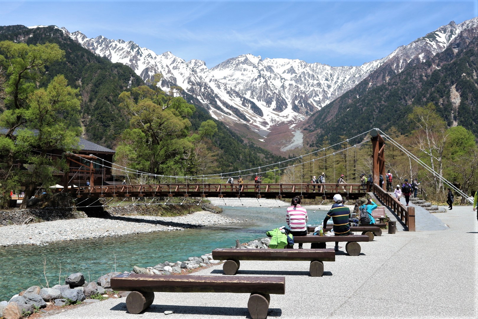 上高地のシンボルになっています。明治43(1910)年にそれまでのはね橋から、つり橋にかけ替えられました。その後4.5回かけ替えられたそうです。