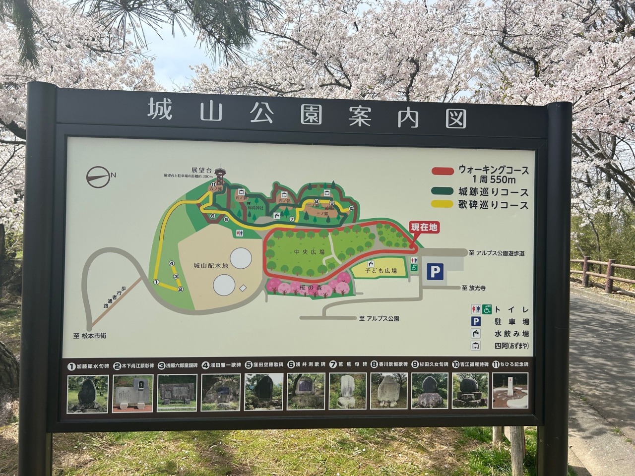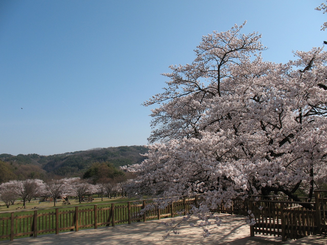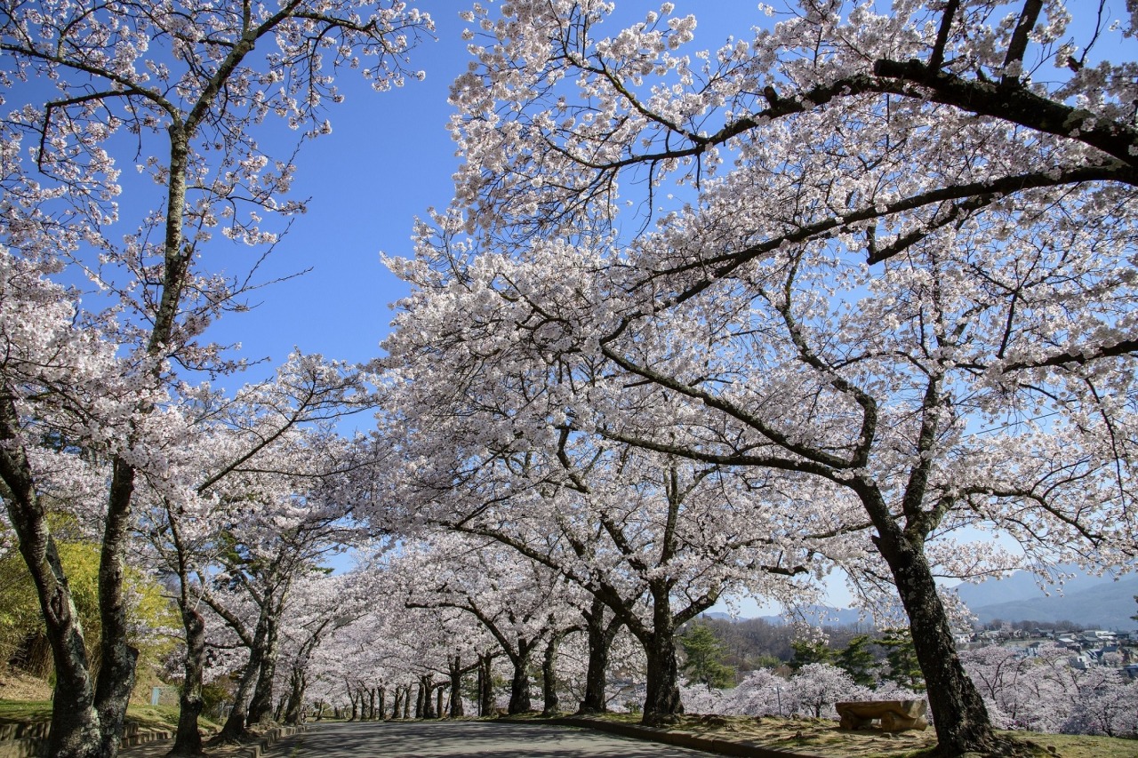 松本市街地北西の丘陵に広がり、北アルプス連峰や安曇野を一望できる眺望が魅力の公園です。春には園内各所で桜が咲き、芝生広場や散策路は花見を楽しむ人々で賑わいます。