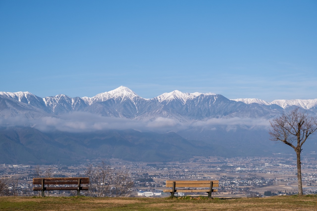 ベンチや芝生が整備され、展望台からはパノラマで松本市を一望できます。街のにぎわいから少し離れ、松本らしい眺めと穏やかな時間を味わえる場所です。