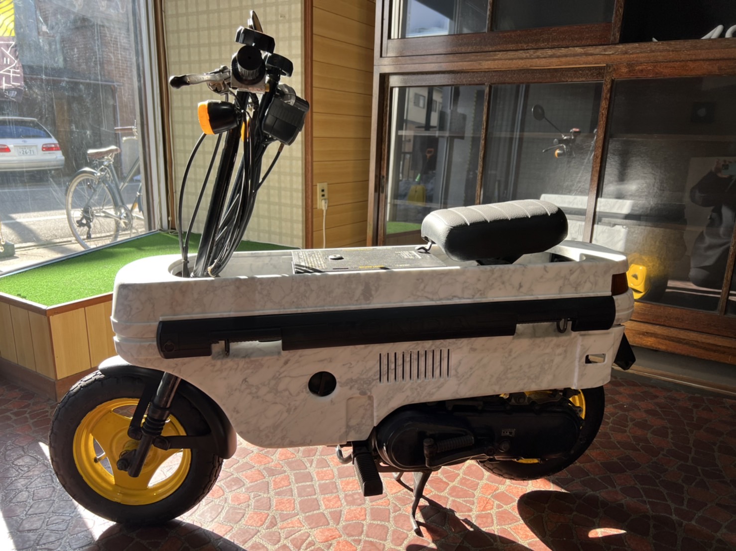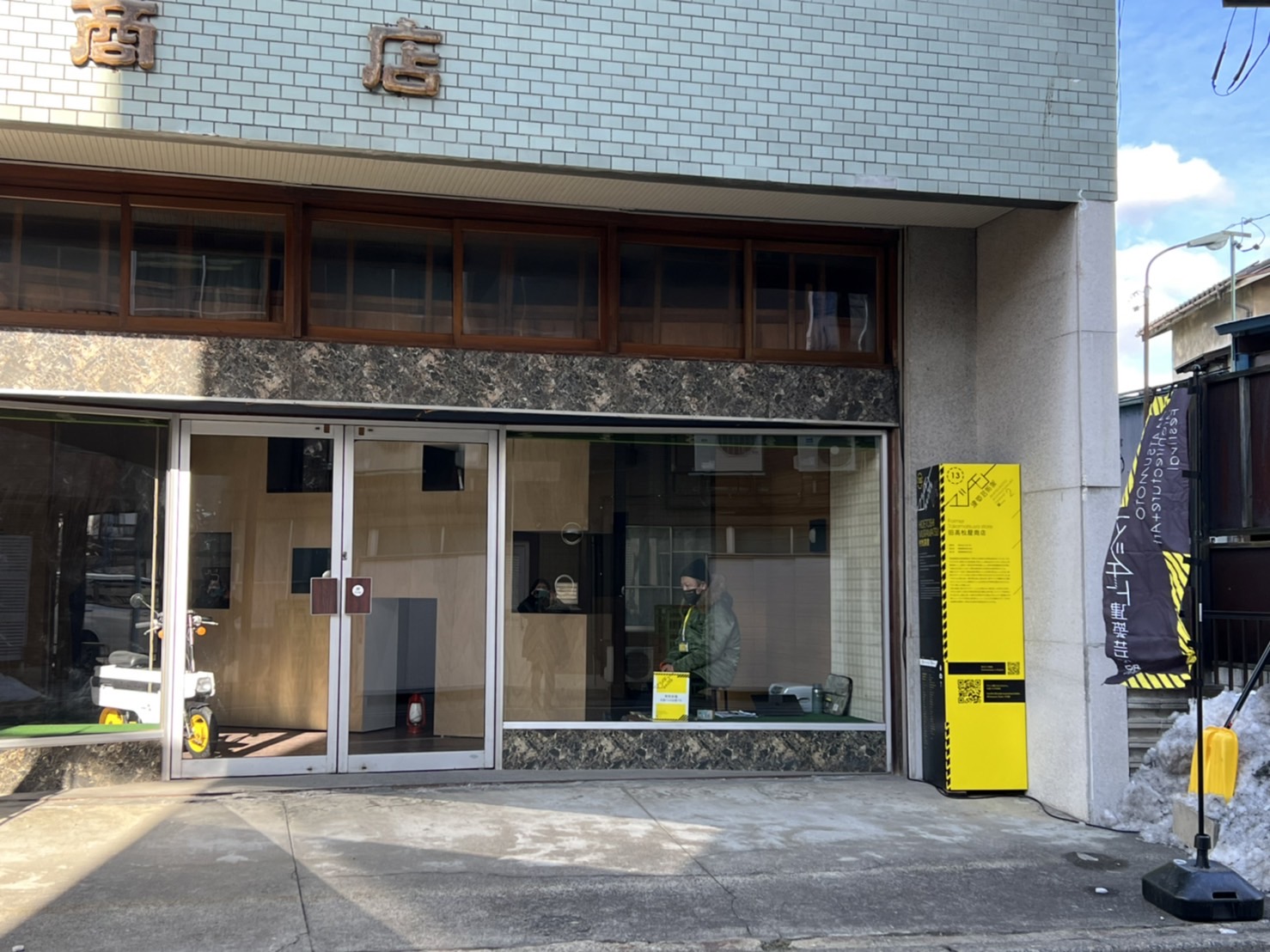 1階の袖壁に張られたテラゾー(人工大理石)は、昭和30~40年代(1955〜1974)に流行した材料で「昭和の香り漂う建築」の床や壁、カウンターや造作材に多く見られる。道路に面した部分は木製引戸の大開口であったが、貸店舗とする時にショーウインドウ形式に造り替えた。ショーウインドウの台輪はテラゾーではなく石目調の化粧板で、材料からも時代の変遷を見ることができる。(マツモト建築芸術祭公式サイトより)