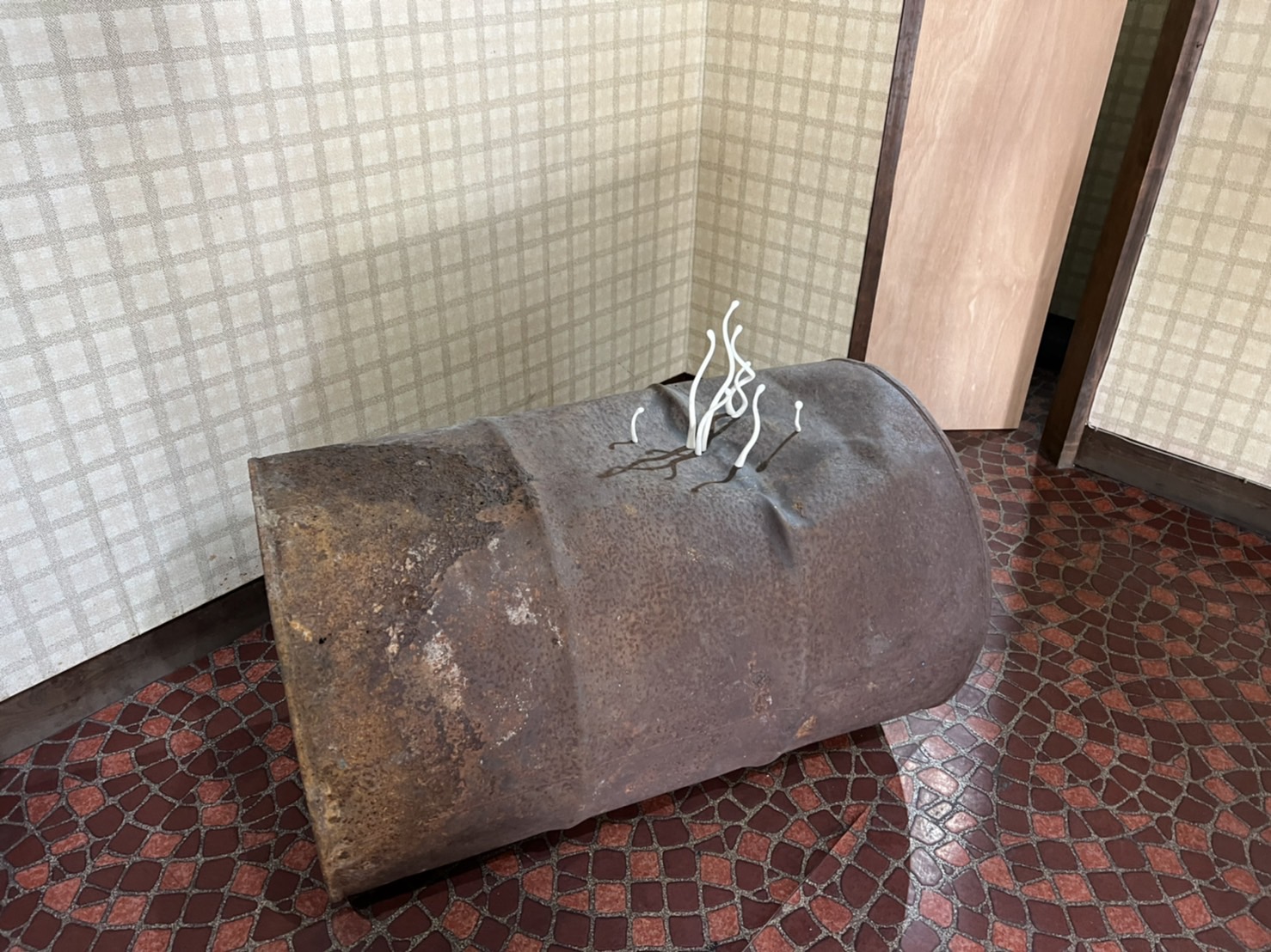 東北のどこかの町で見つけたドラムカンを持ち帰り作品にしたそうです。