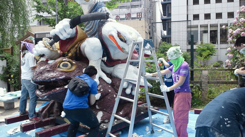 7年後の2012年に当時ガマ侍を制作した東京藝大デザイン課のメンバーが2回に分けて、松本に泊まりで修繕に来てくれました。