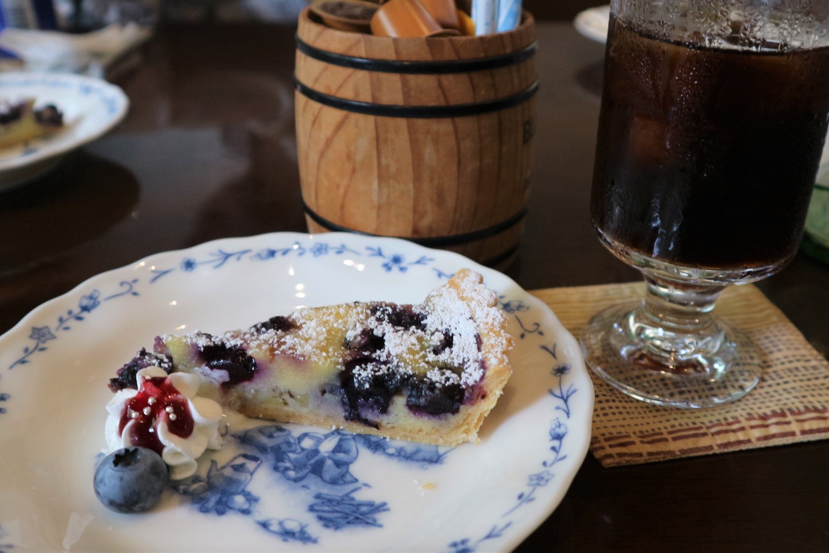 地元で取れたブルーベリーを使った手作りケーキとアイスコーヒー ランチタイムに食事とコーヒーを注文すると200円になります。
