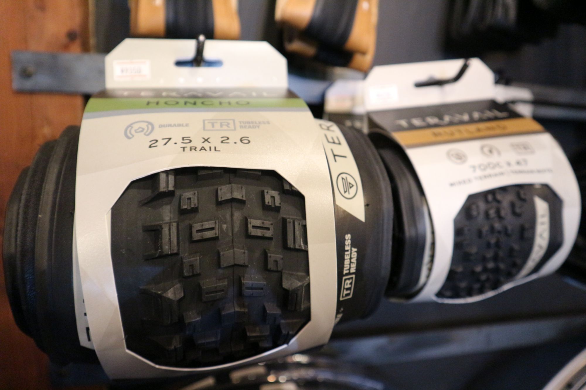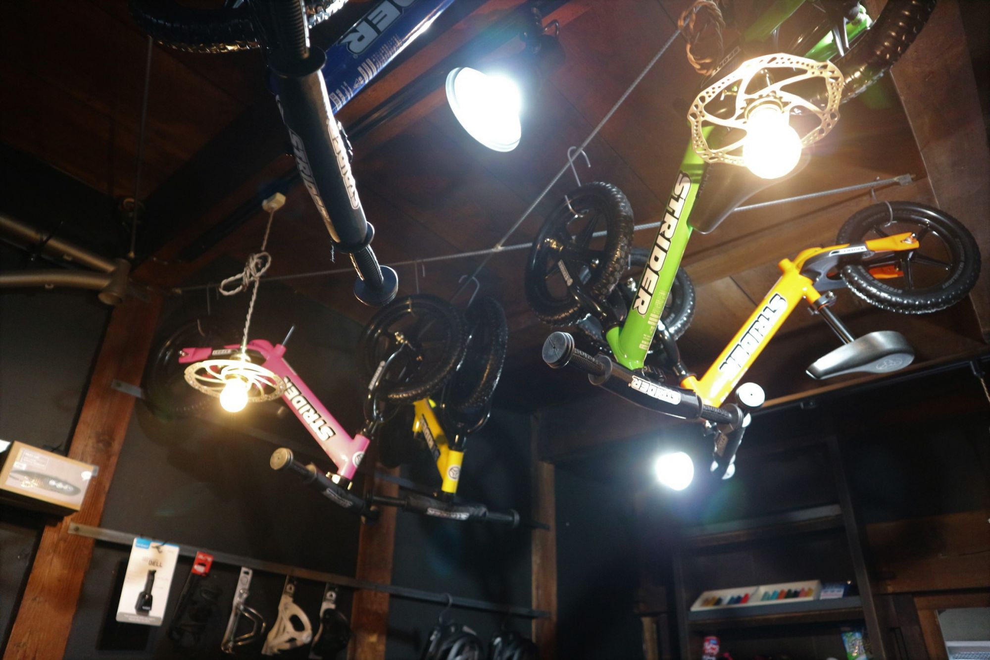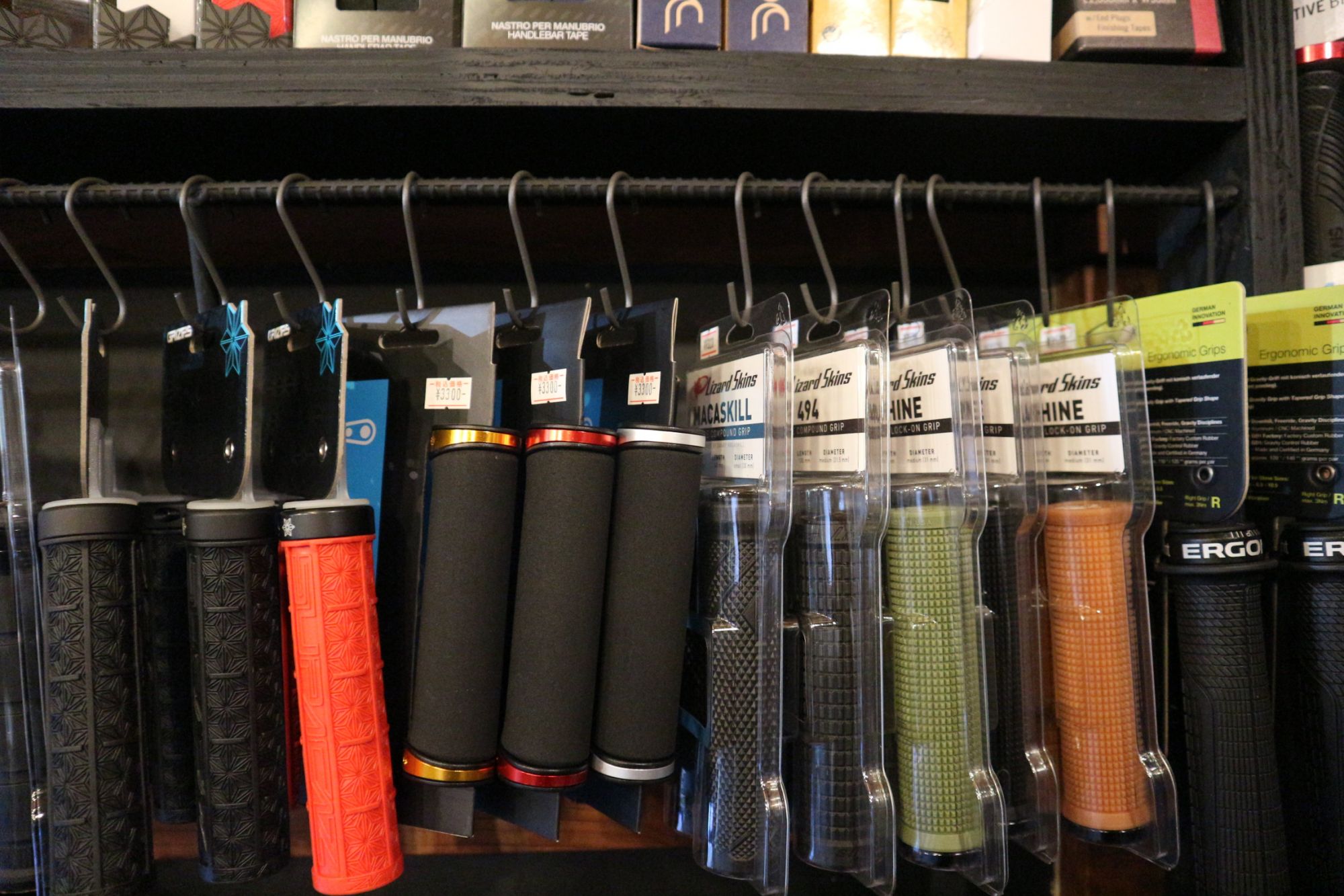 1階 自転車のパーツ・ヘルメットなどが壁に綺麗に並んでいます。