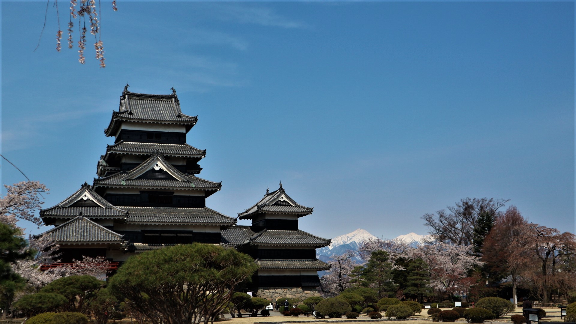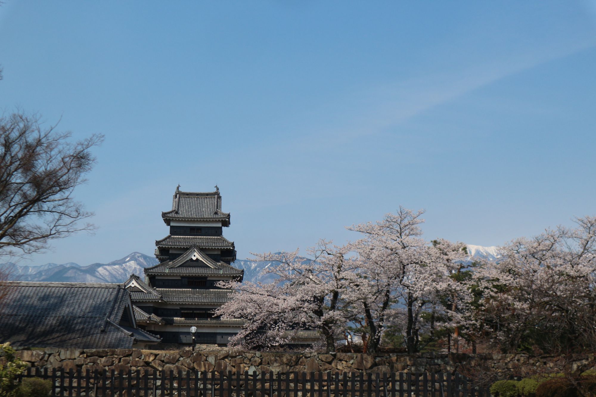 国宝松本城本丸庭園より天守と山と桜
