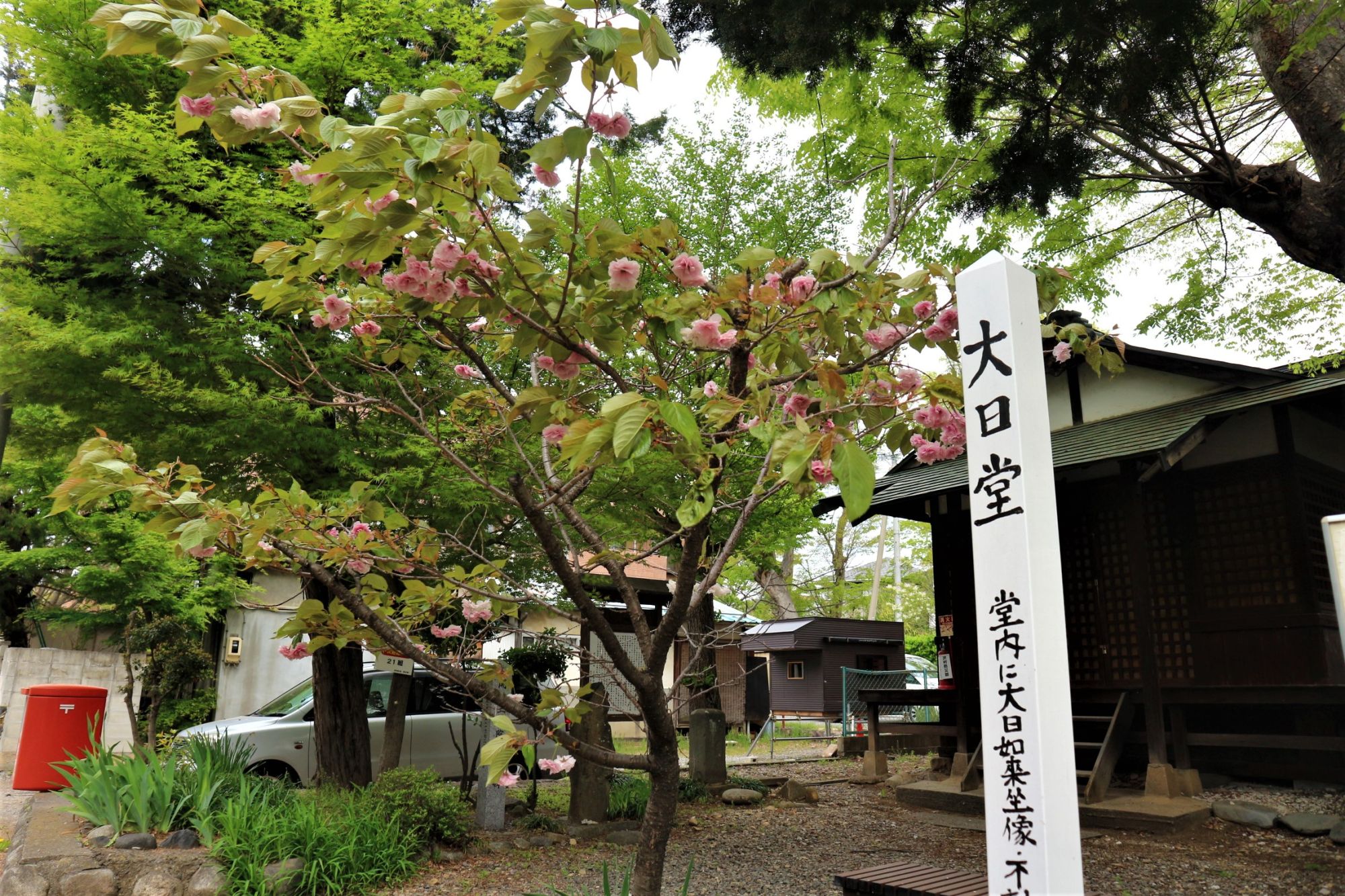 松本市沢村にある「大日堂」4月26日(火)八重桜が咲いています。場所は、松本市中央図書館の北にあります。