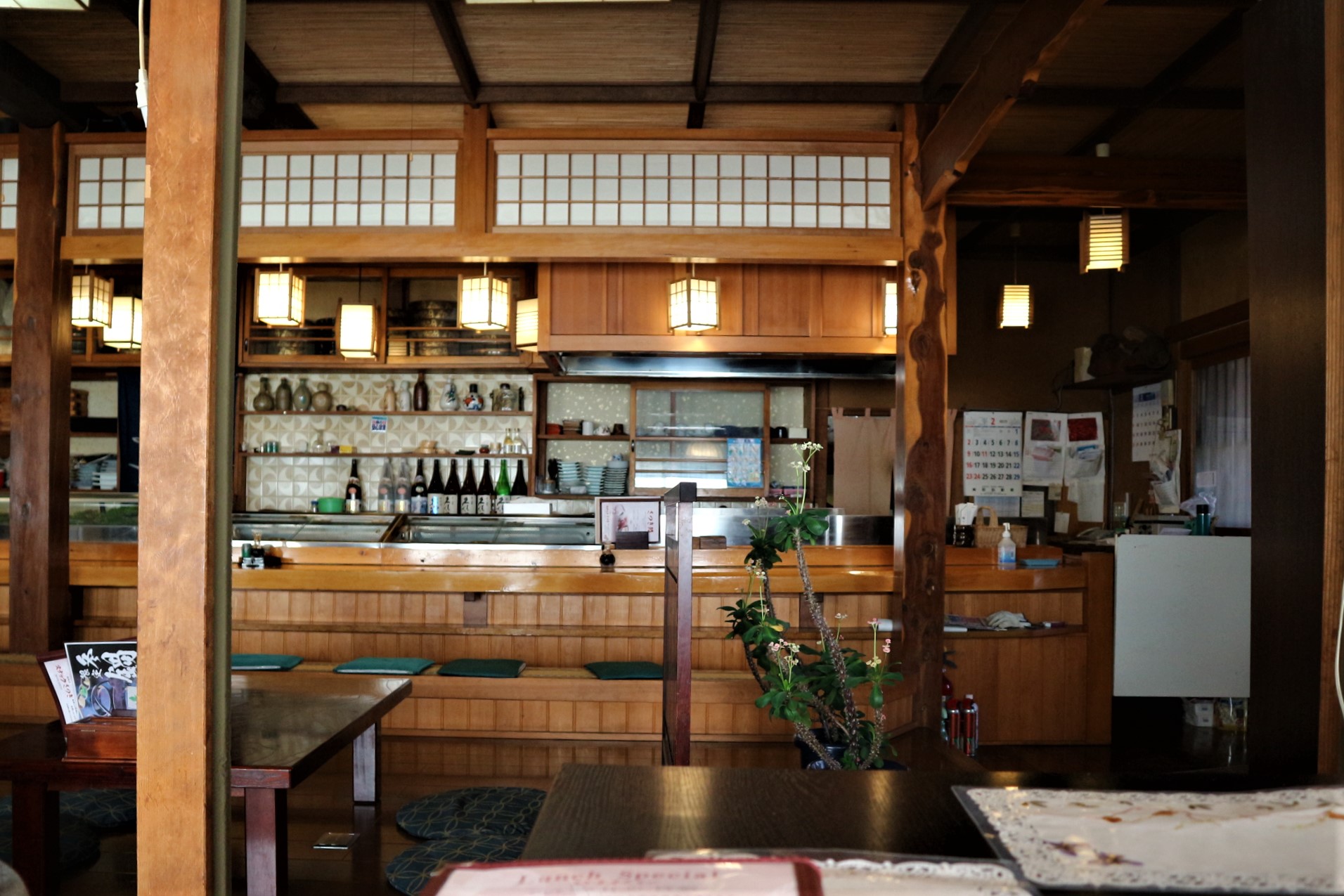 入口からすぐに靴を脱いで上がります。店内は、カウンター席と板の間の低いテーブル席、畳にテーブルを置いたテーブル椅子席の3種類があります。