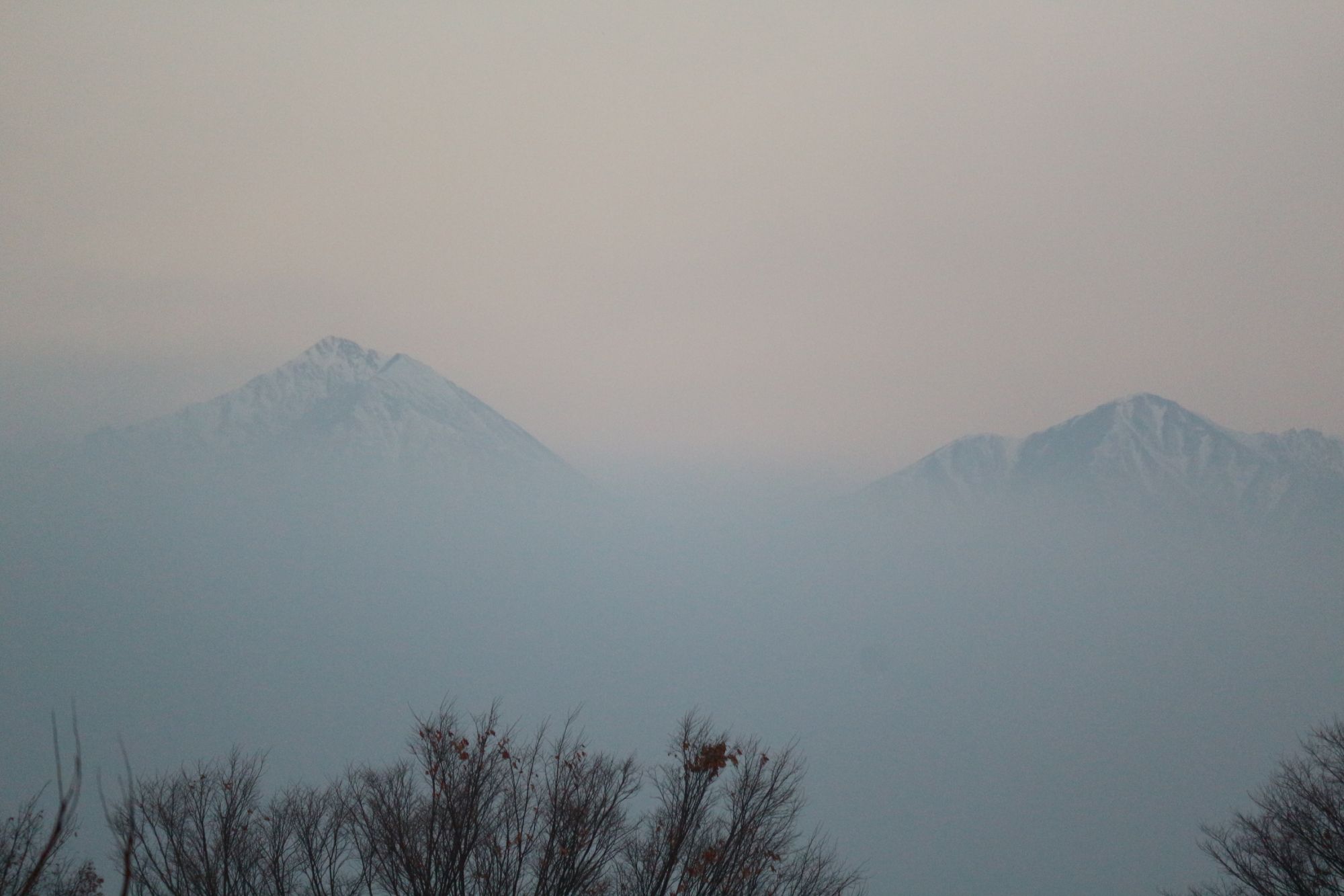 朝北アルプスを撮影していたら、太陽が昇り始めると気温が上がり徐々に霧が立ち込めて山を覆っていきました。