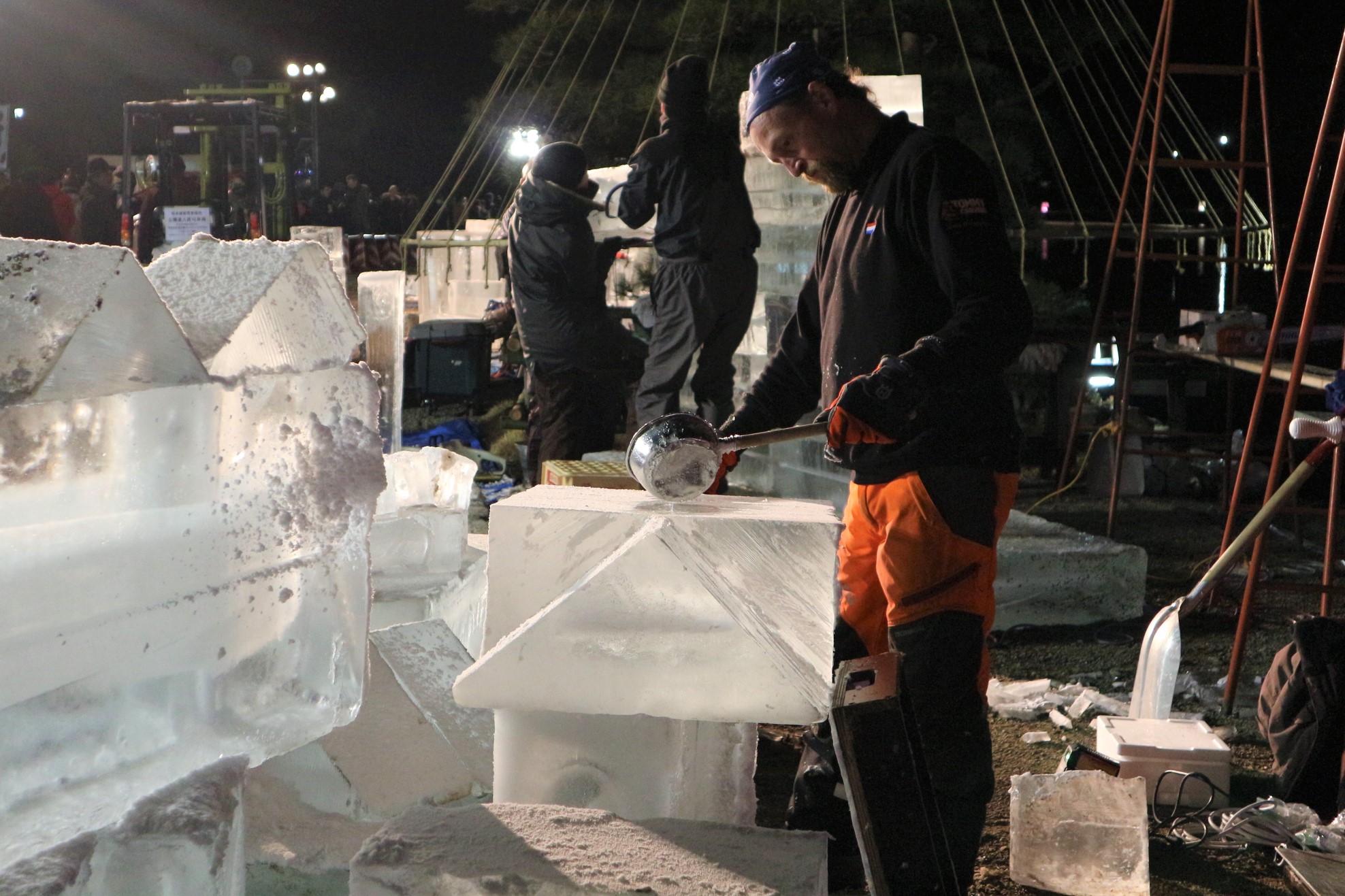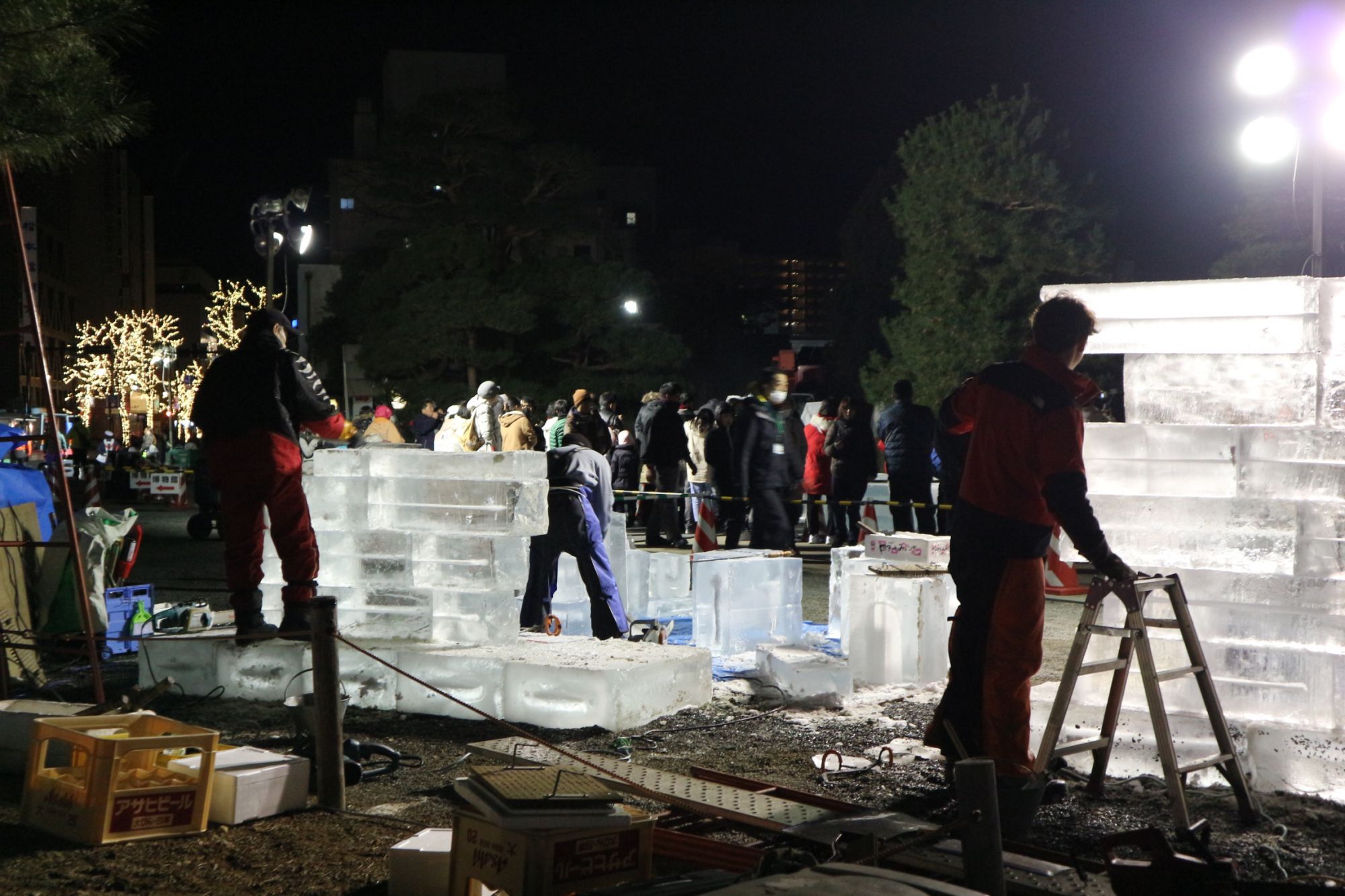2日の朝 完成した作品が並びます。人気の氷の滑り台をはじめイベントも盛り沢山です。ぜひお出かけください。