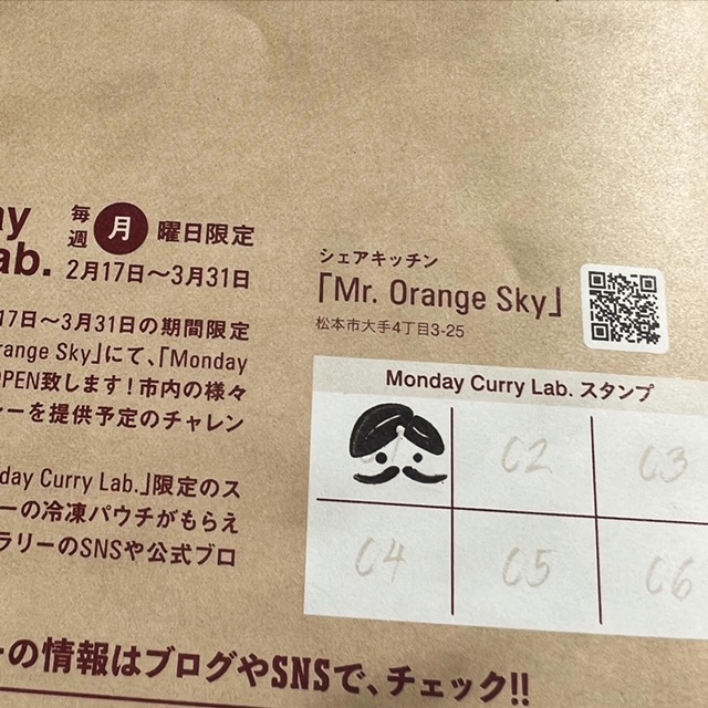 第9回松本カリーラリー参加の80店のスタンプとは別に、「Monday Curry Lab.」でカレーを食べてもらえるスタンプを、パンフレットの背表紙にあるスタンプ欄に集めると、スタンプ4つ以上で「Monday Curry Lab.」で提供した限定カレーの冷凍パウチがもらえます!