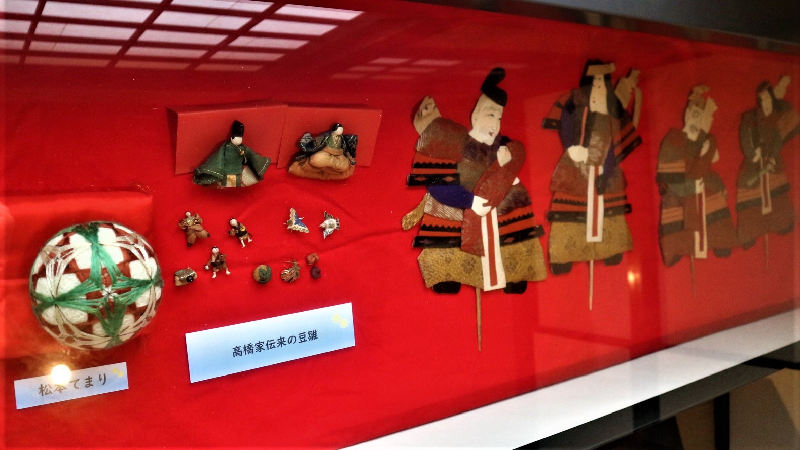 松本手まりと押絵の間に「豆雛」が並んでいます。こんな小さなお雛様初めてみました。