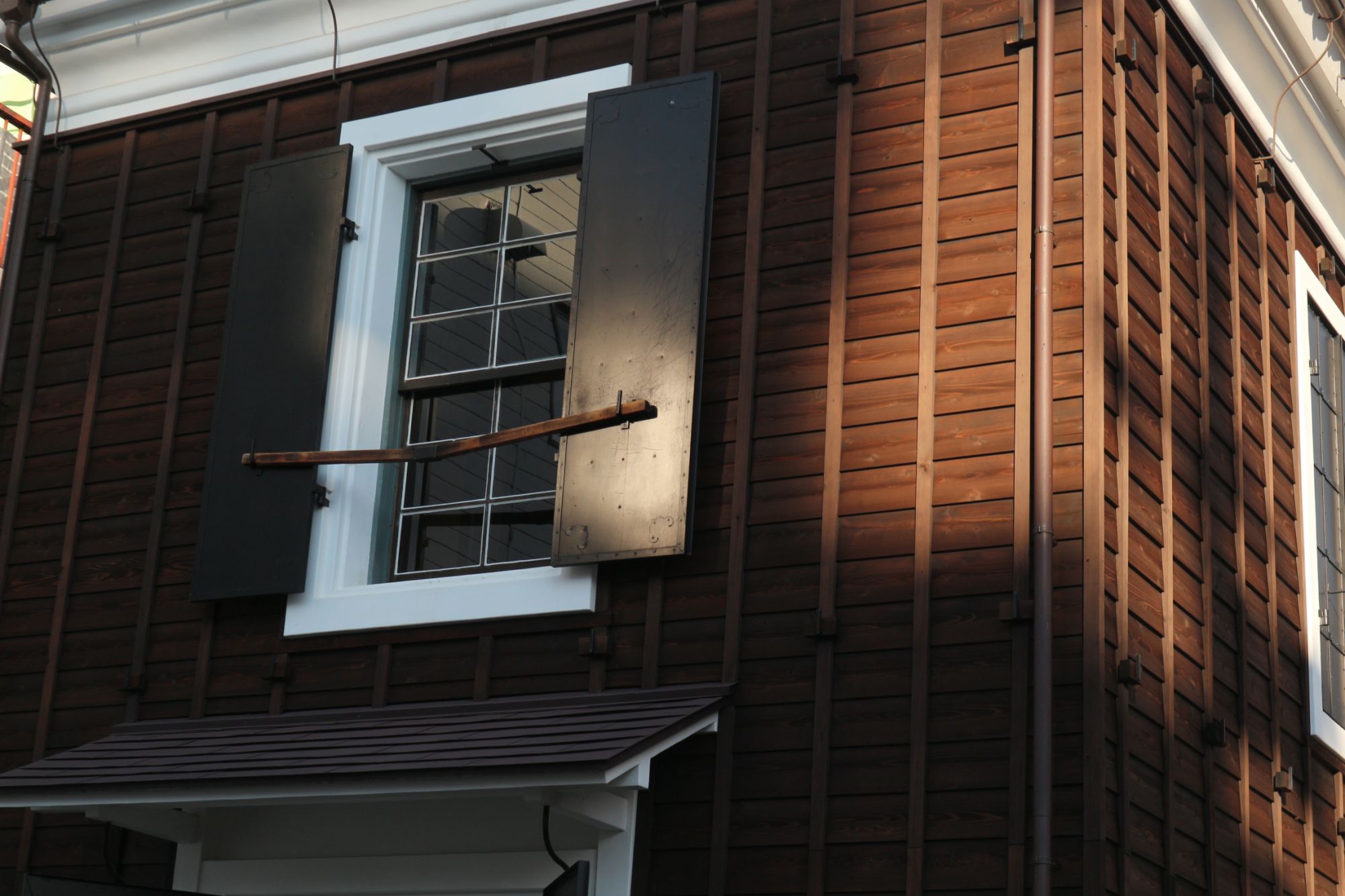 建物の外部は、漆喰壁の保護のため、取外し可能な下見板に覆われ、三角形の破風には、唐草模様の木彫レリーフが装飾されています。ガラスやトタンといった、当時まだ」高級であった部材を使うなど、細部にまでこだわりをもってつくられています。
