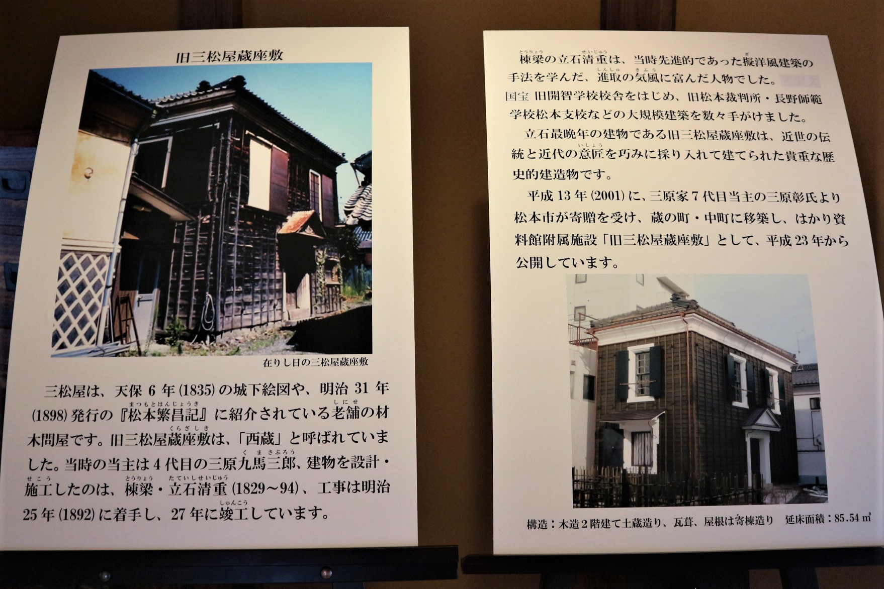 はかり資料館の第3展示室「旧三松屋蔵屋敷」は、国宝旧開智学校校舎休館を設計施工した立石清重氏が手がけたものです。