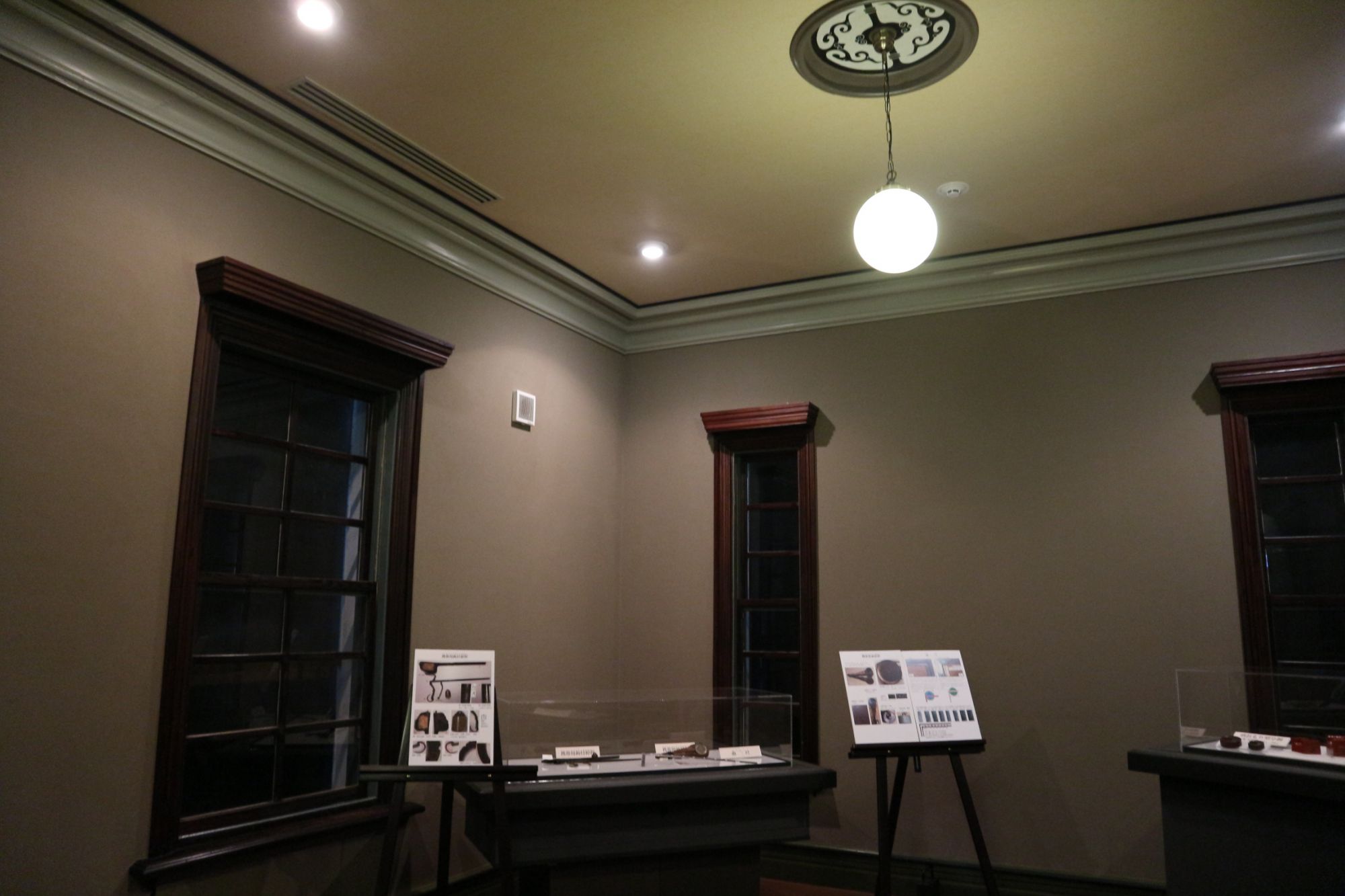 2階の洋間は、立ち上がりの高い上げ下げ式ガラス窓、天井のランプ吊りに描かれたモダンな唐草模様、床板に使われている丸釘、当時、天井は5重の紙張り、ケヤキの重厚な額縁にカーテンボックスを付け、厚手の白いブラインドが付けられていました。