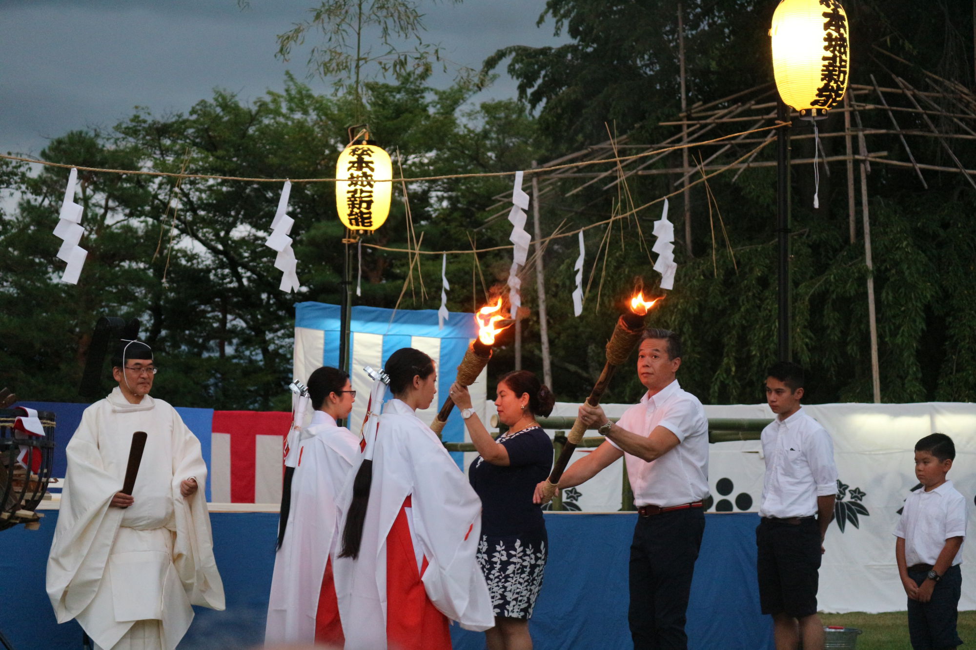松本市に在住のスペイン人のご一家の皆さんが、巫女さんより火を受け取りかがり火に点火されました。