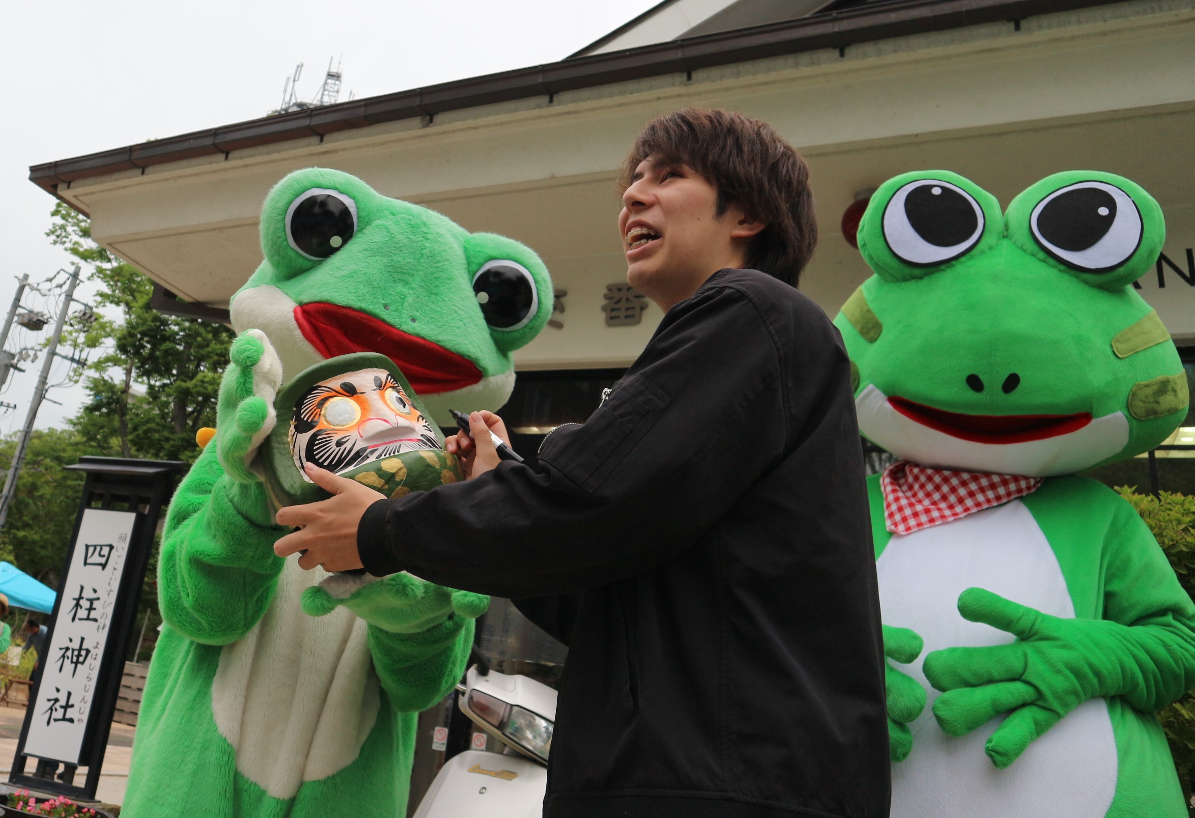 10時からのオープニングセレモニーは、「かえるの唄の輪唱」と「かえる達磨」にまつりの成功を祈り目をいれます。