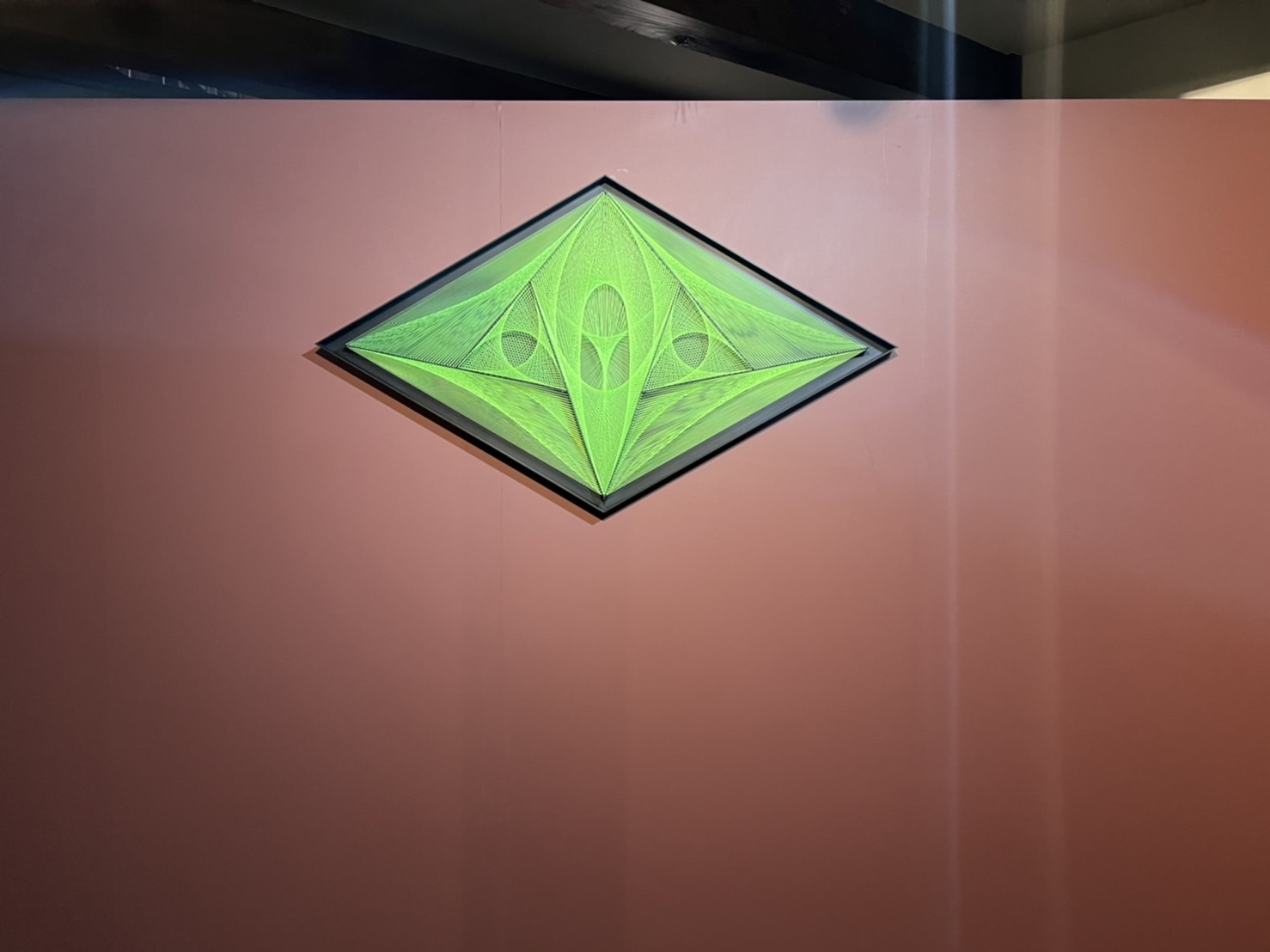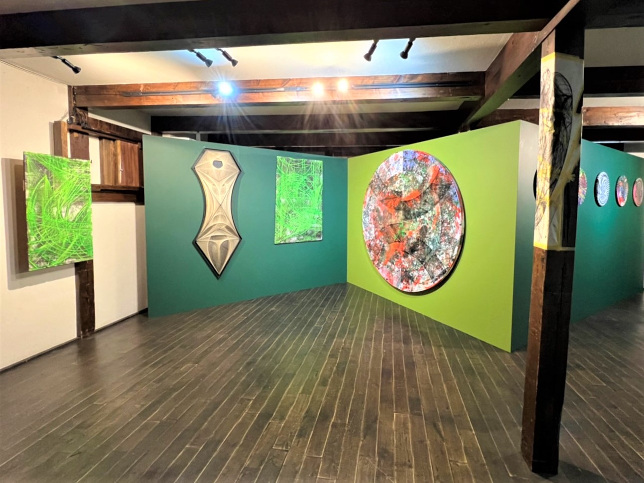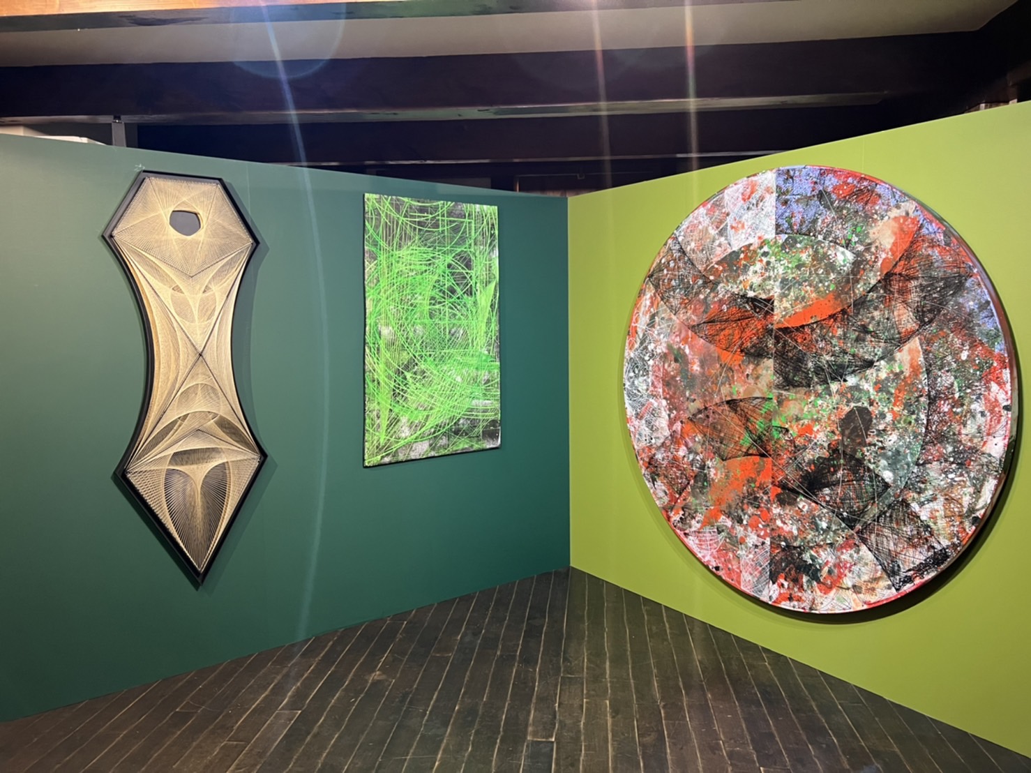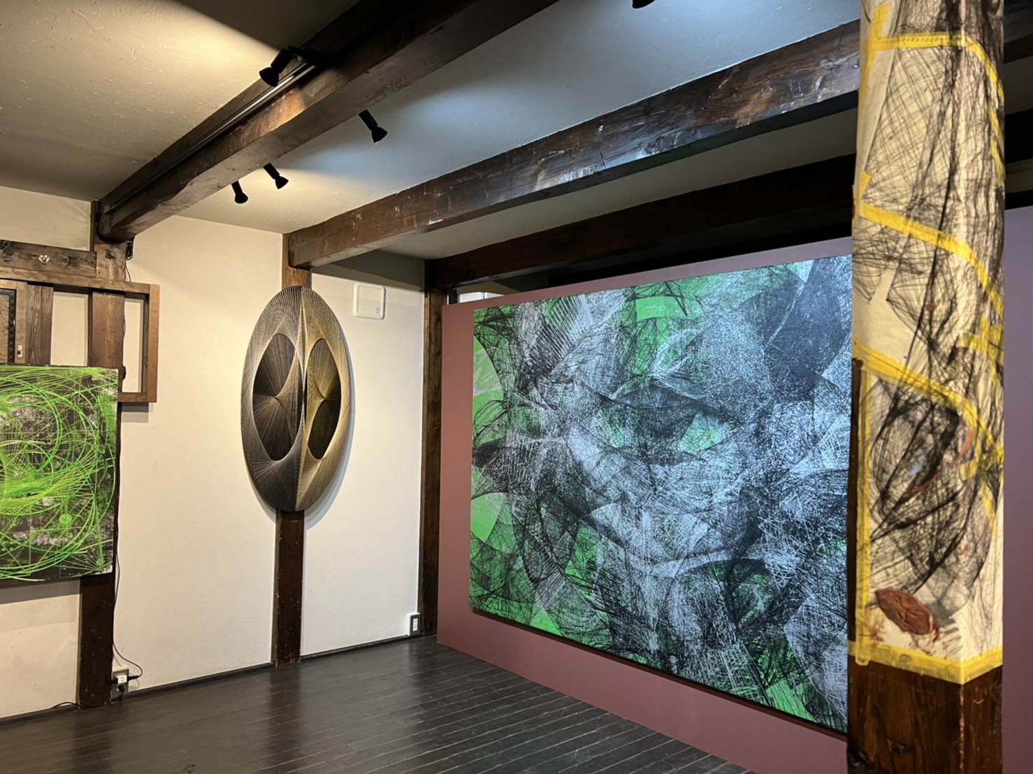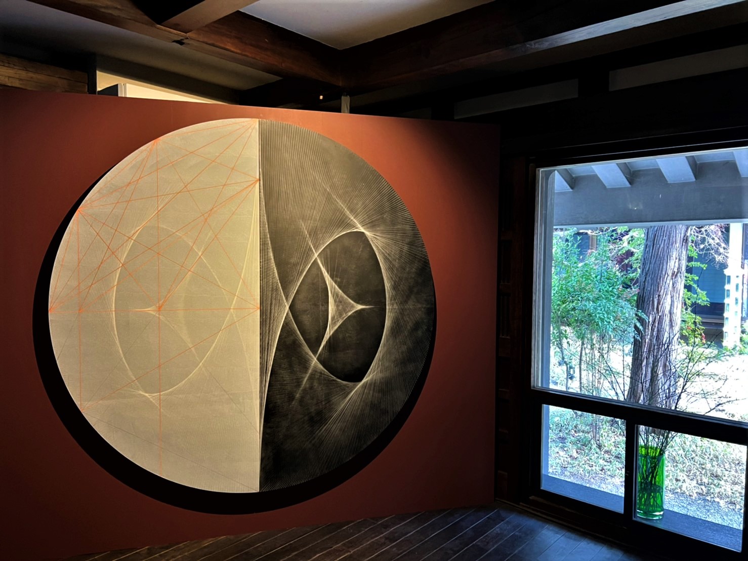 歴史を重ねた蔵の中に映える幾何学的デザインの美しい作品