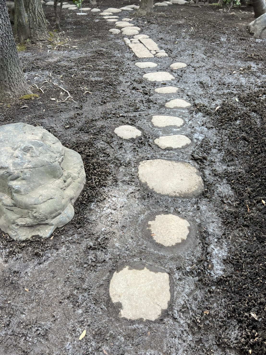 茶室からの敷石 周りは先週の雪のせいか、地面がぐしゅぐしゅでまさにこのような時のために、規則正しく敷かれた石なんだと石の上を歩き感心しながら茶室を後にしました。