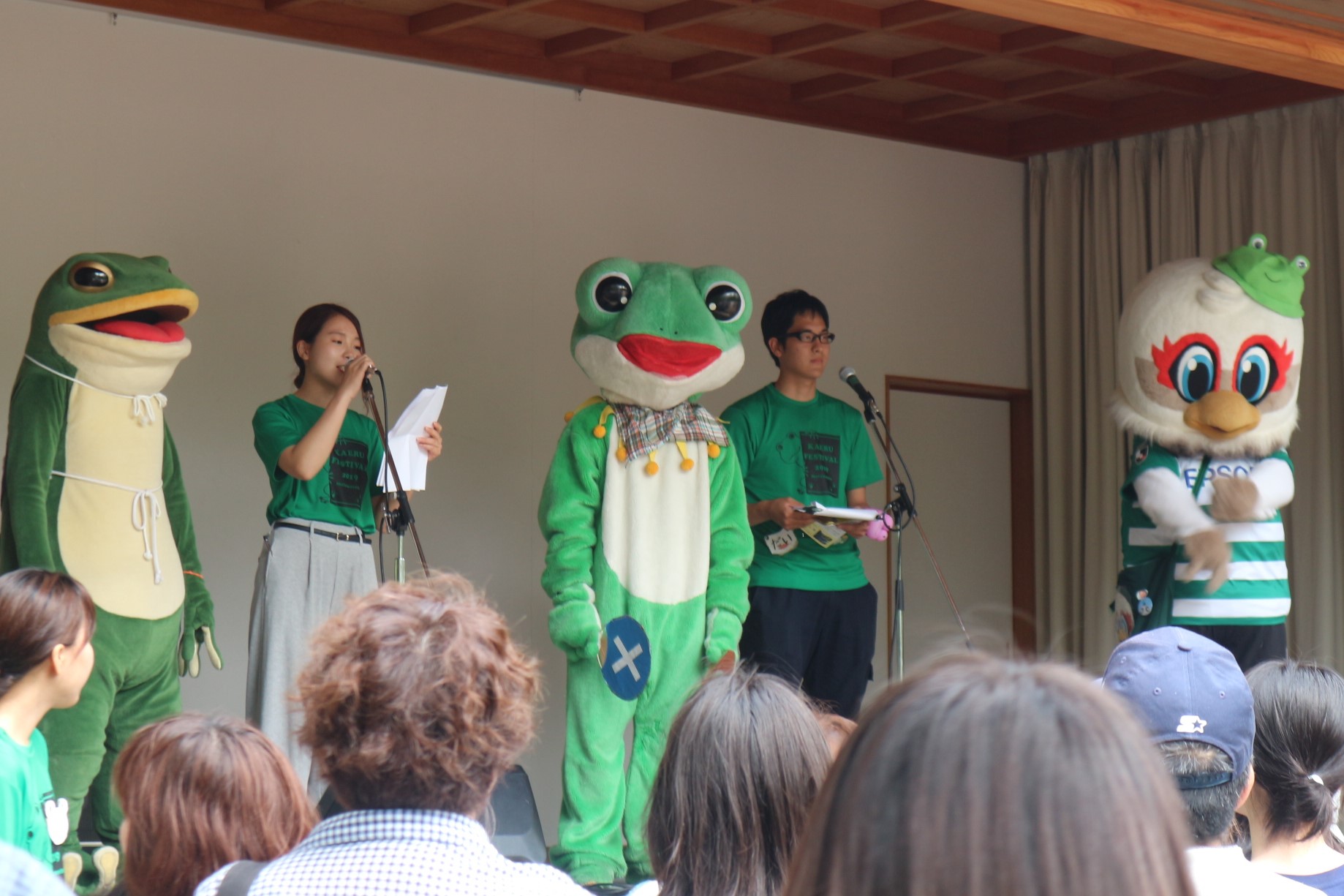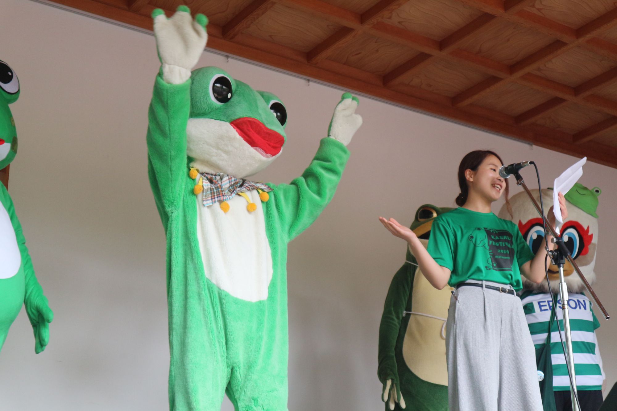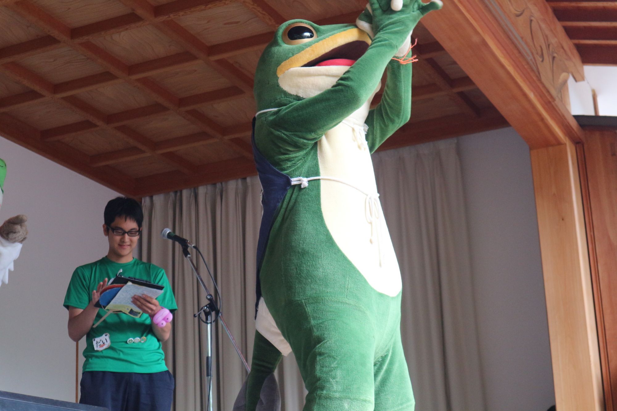 3匹のかえるとトリがステージに上がる「かえるサミット」