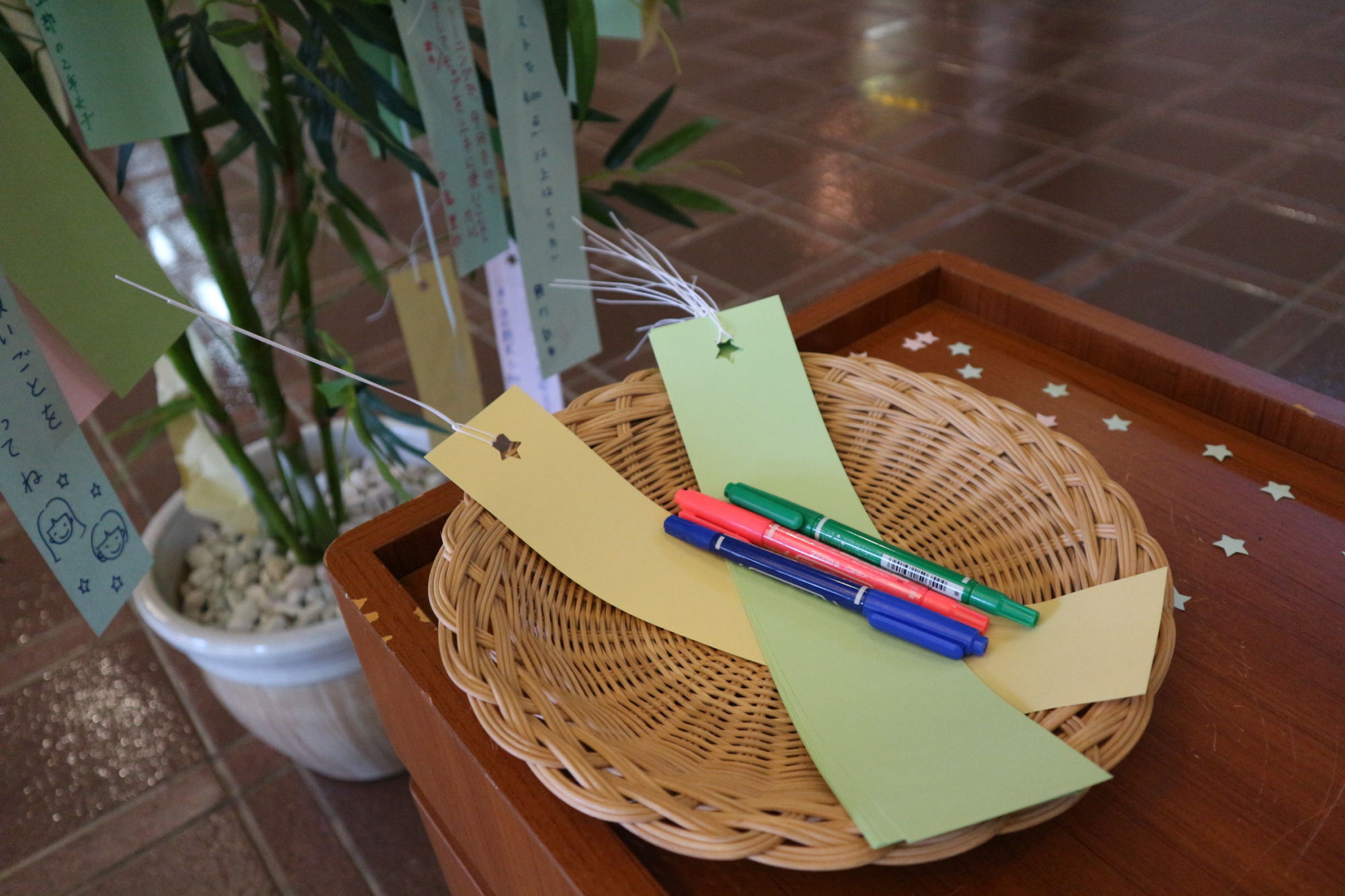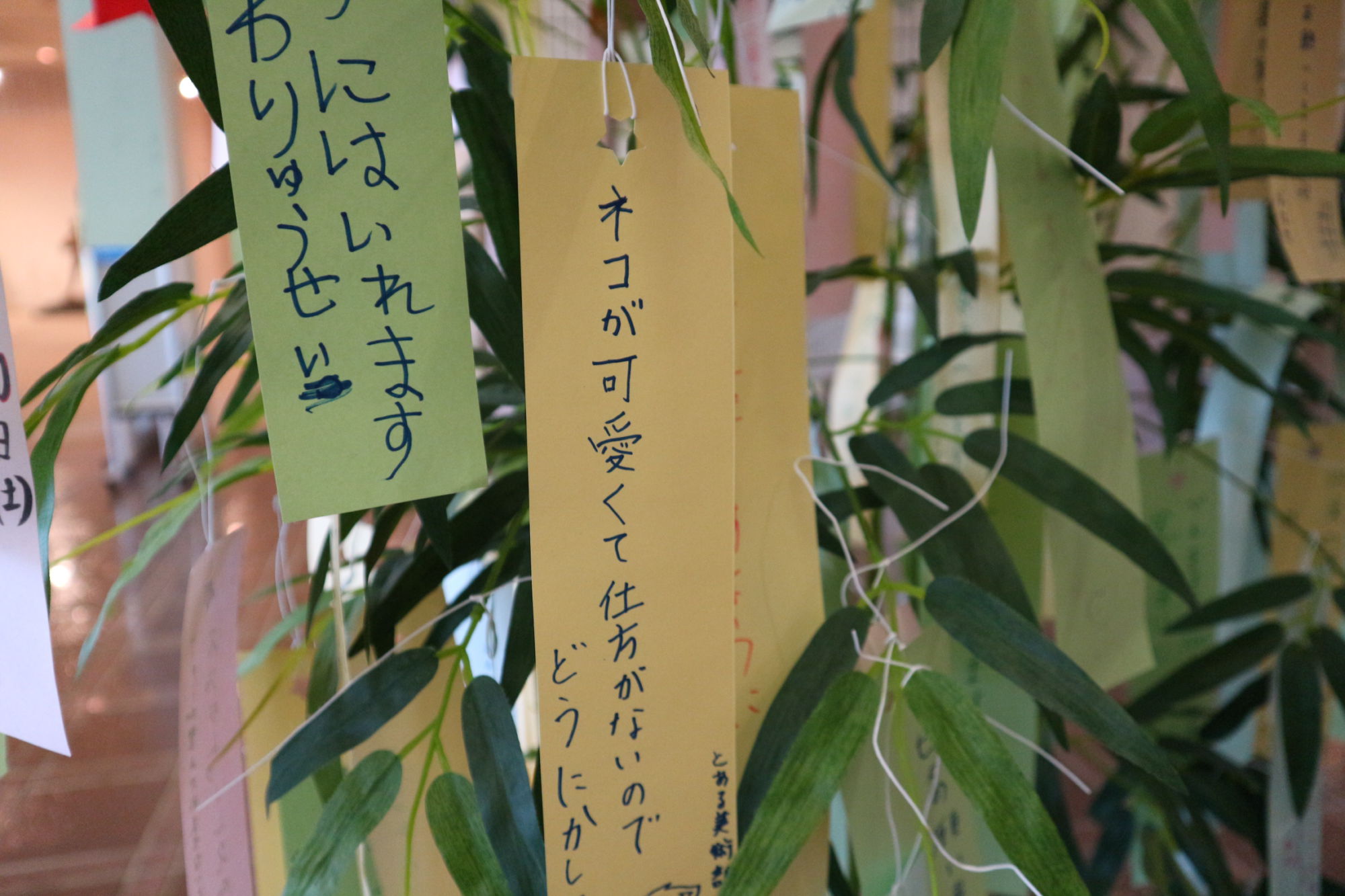 月遅れの七夕の笹飾りに来場者が短冊に願いを書いて吊るせます。