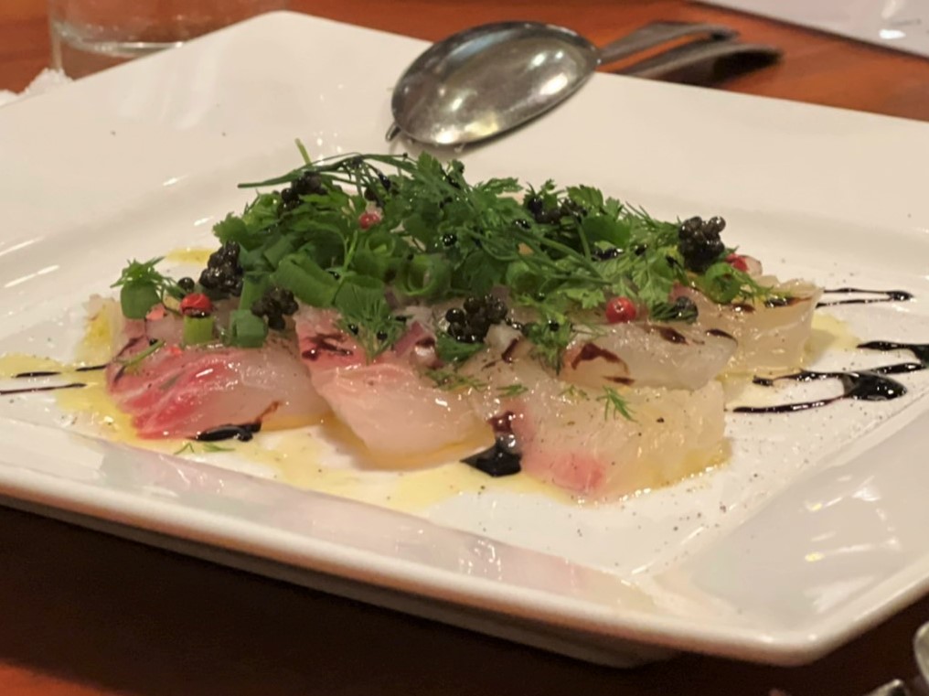 真鯛のカルパッチョの上に香菜とイタリア産のキャビアを散りばめた贅沢な一品
