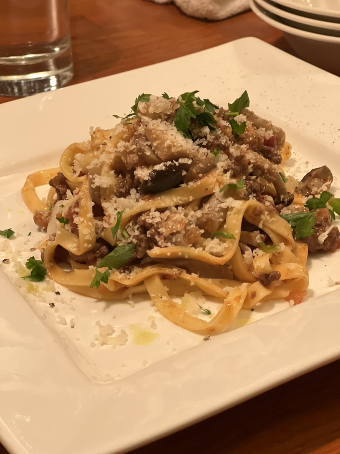 平べったい手打ちパスタ キノコと大き目な挽肉を絡めています。麺の美味しさを楽しめます。