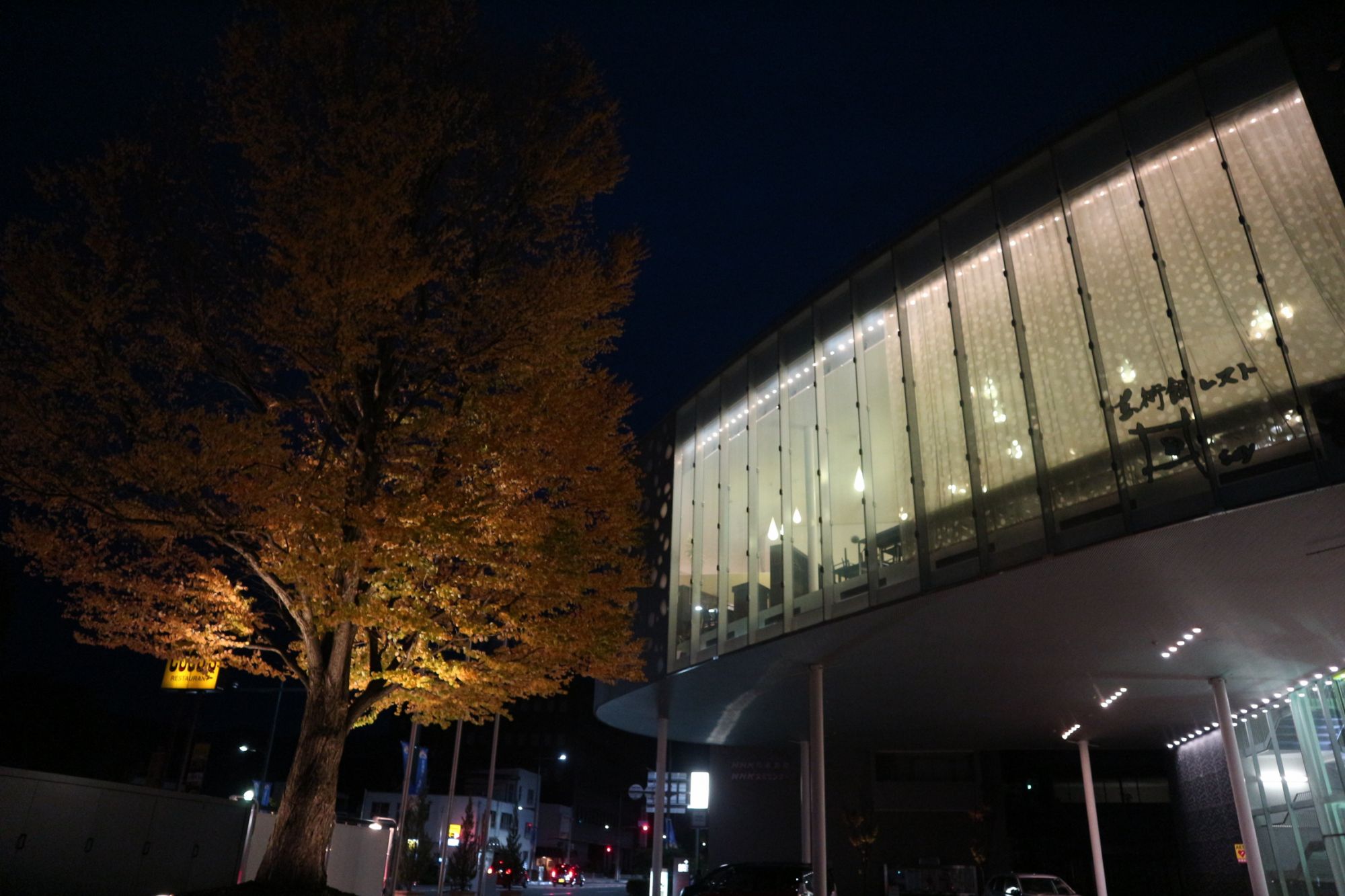 夜のライトに照らされたまつもと市民芸術館の周りの銀杏の木が黄色く色づき始めています。