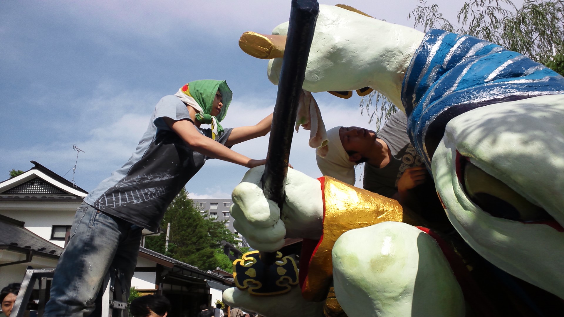 7年後の2012年に当時ガマ侍を制作した東京藝大デザイン課のメンバーが2回に分けて、松本に泊まりで修繕に来てくれました。
