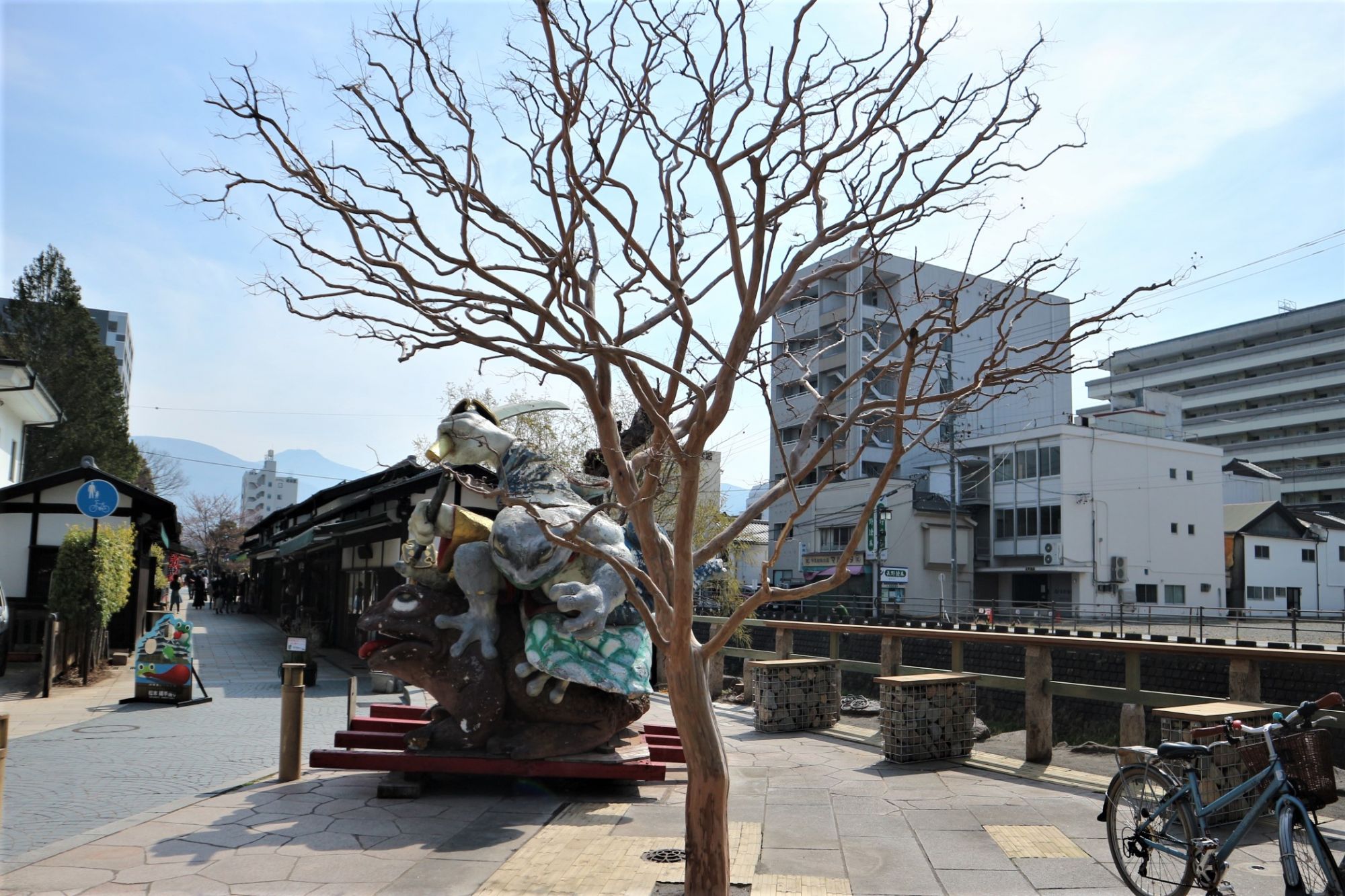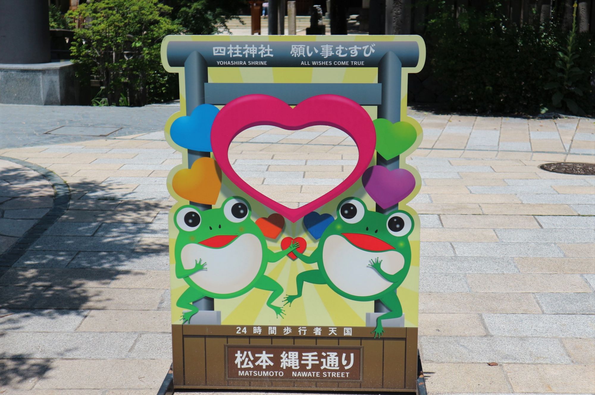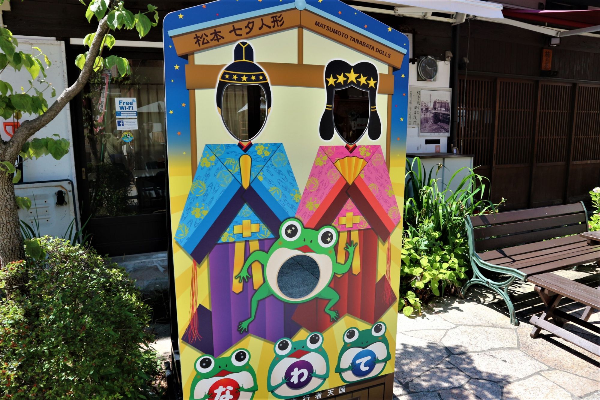通りには多くのカエルの石像やカエルの顔抜き、カエルの専門店もあります。