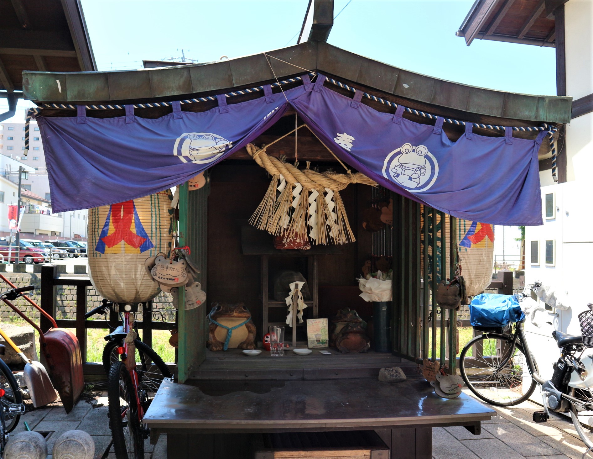 通りを歩いていくと中ほどにカエル大明神が祀られているのが見えます。