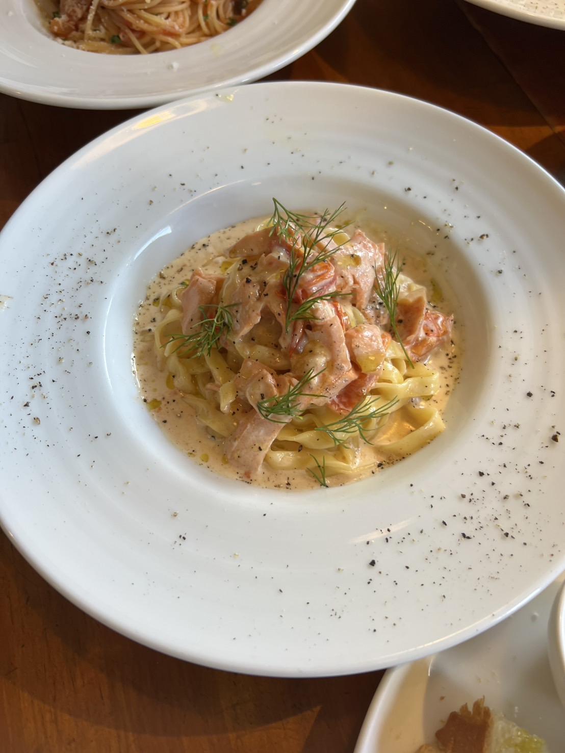 平たいパスタにトマトクリームソースが絡みとても美味しい。