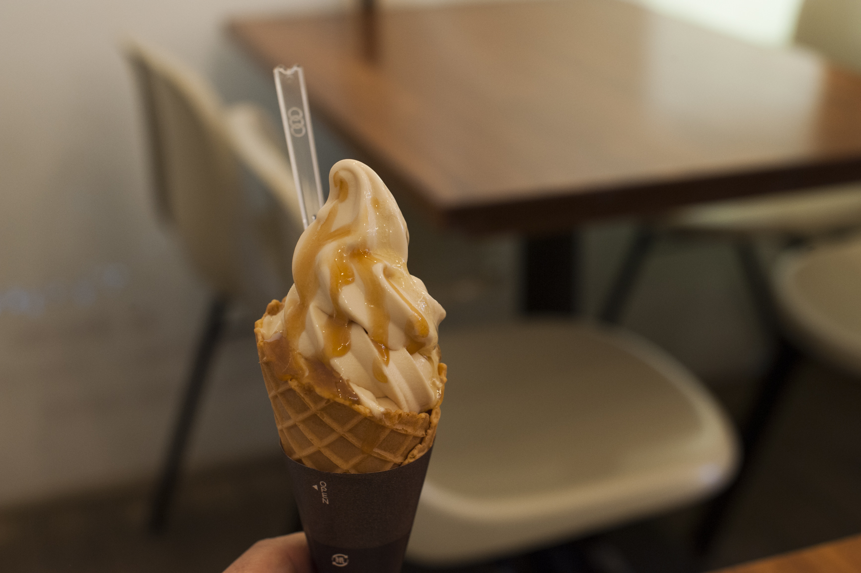 はしごチケットを出すと、トッピング4種からサービスしていただけるということで、キャラメルもサービスでつけていただきました。左側にキャラメル、右側に蜂蜜で甘×甘!ですが、味の変化を楽しみながら、それぞれに美味しくいただきました。コーンはパリッと焼けた香ばしいクッキーで、なかなか食べ応えがありました。