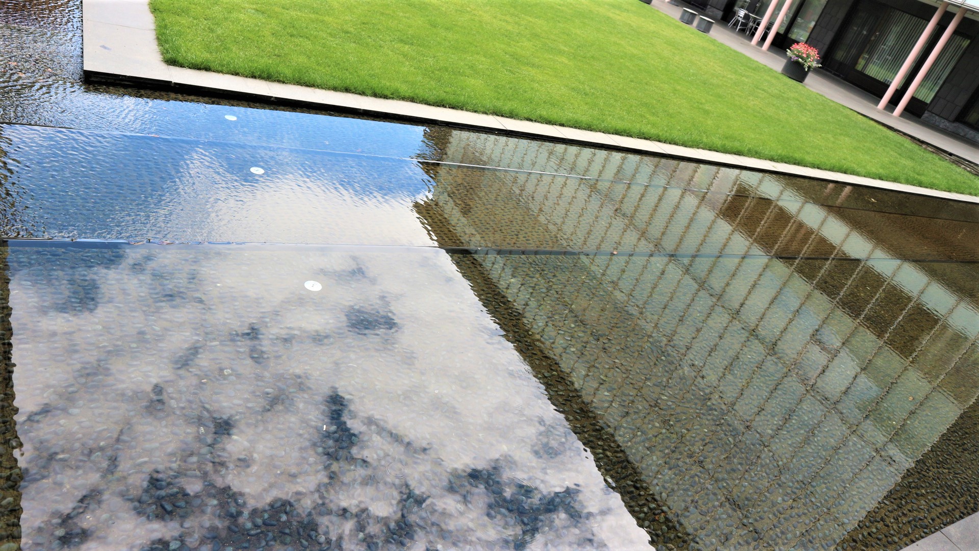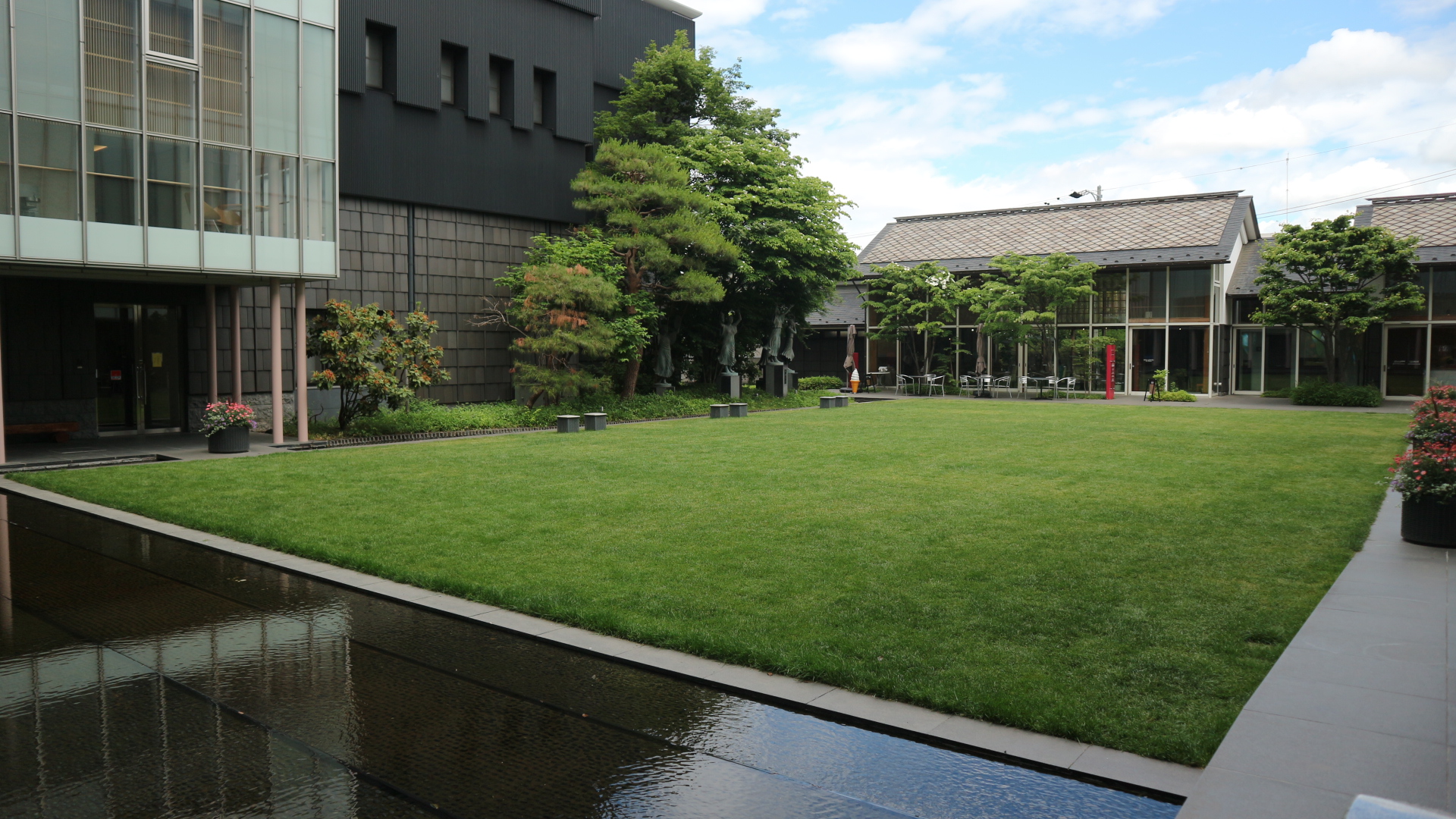 松本市美術館のあるエリアは、地下から湧き上がる湧水の宝庫です。美術館中庭には、水がはられていて心和む空間を演出しています。