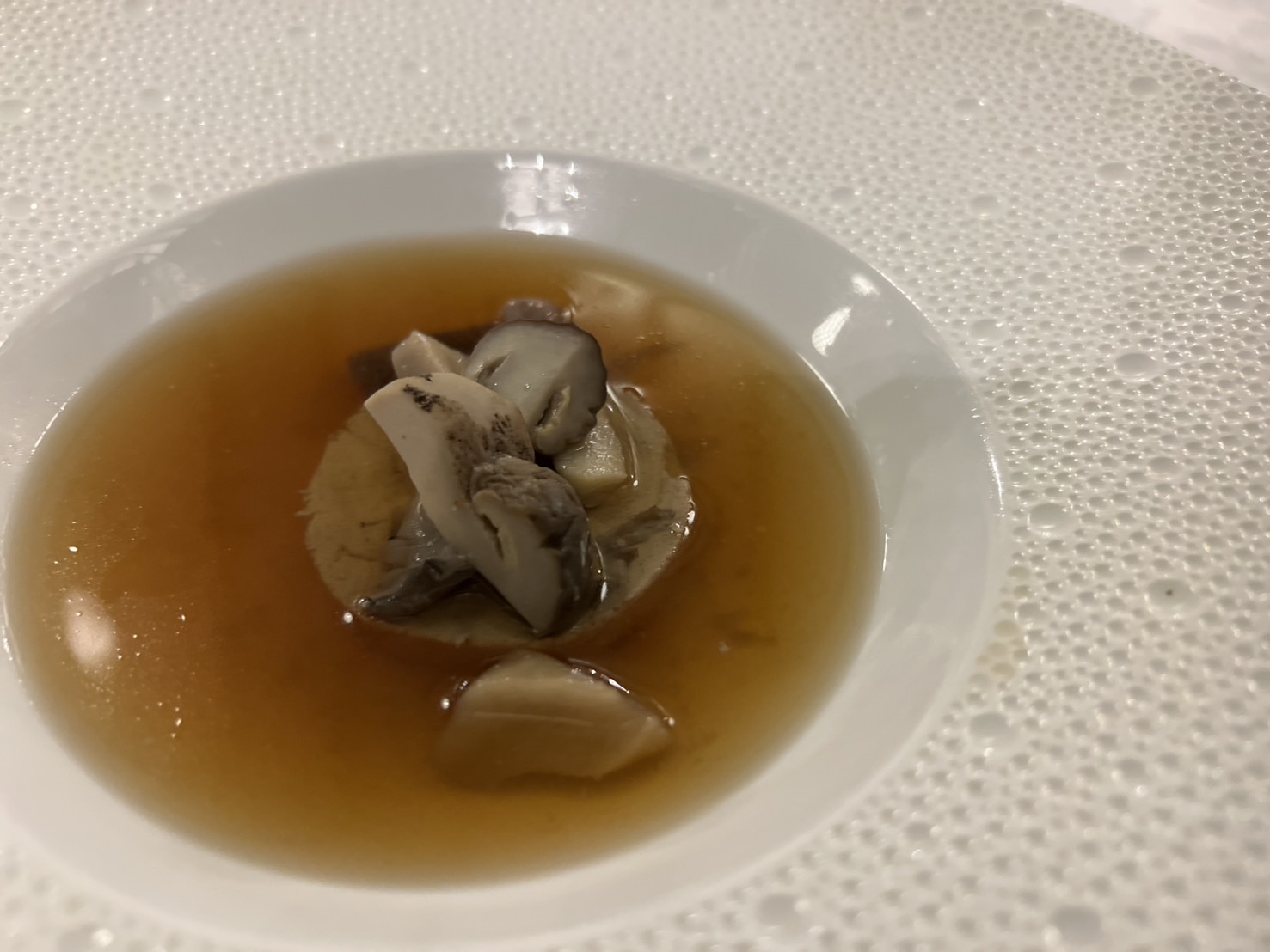 セップ茸のコンソメ 牡蠣と栗のムースリーヌ添え