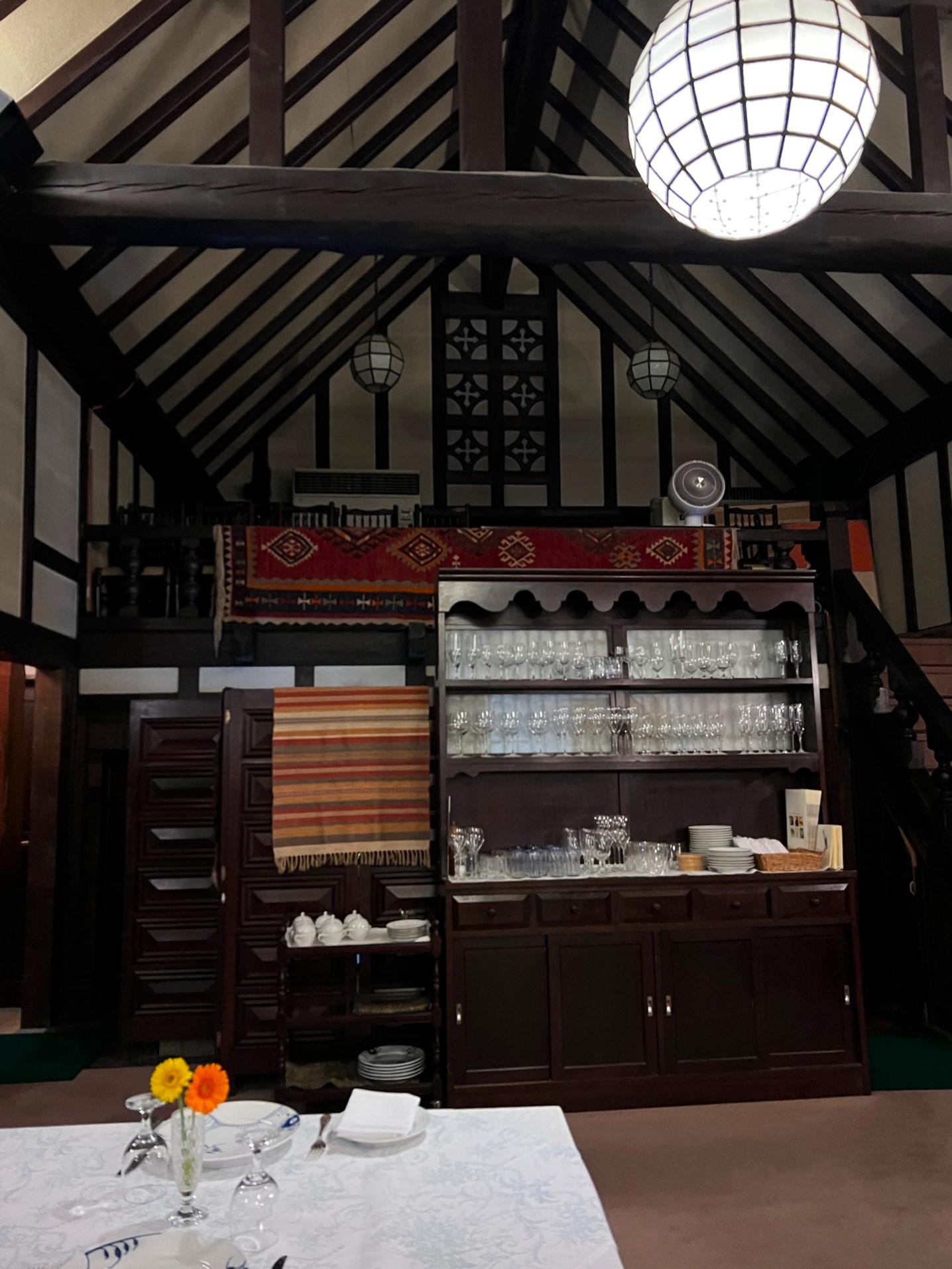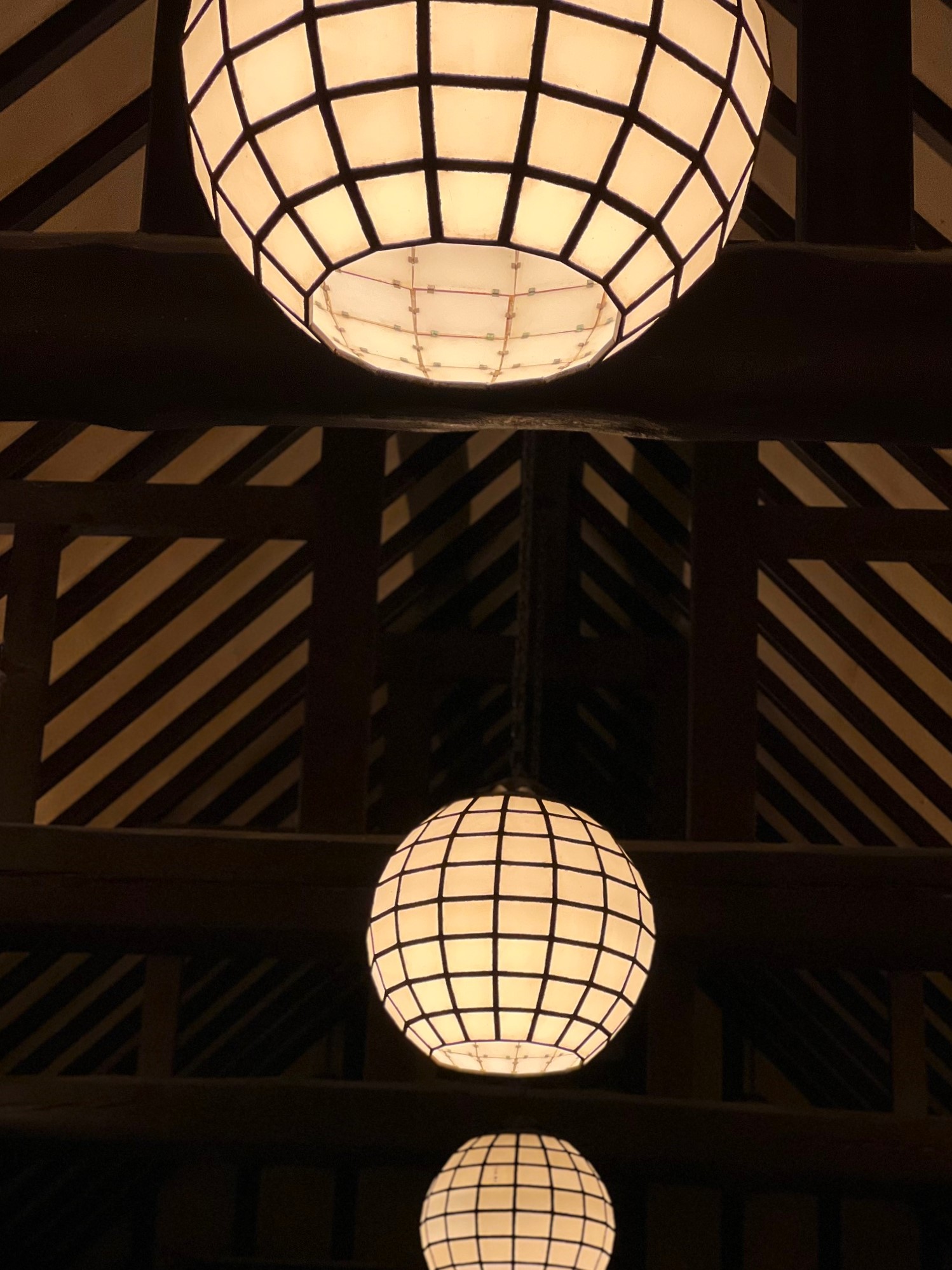 圧巻されます。太い梁の合間から吊るされる照明は、松本民藝調です。