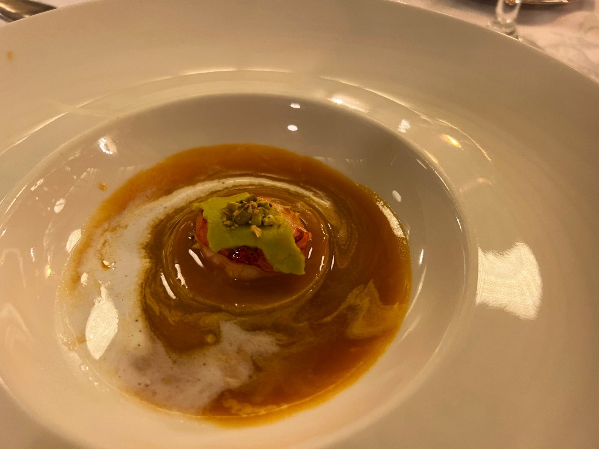 オマール海老のビスクに栗を裏ごししたソースとピスタチオがトッピングされています。