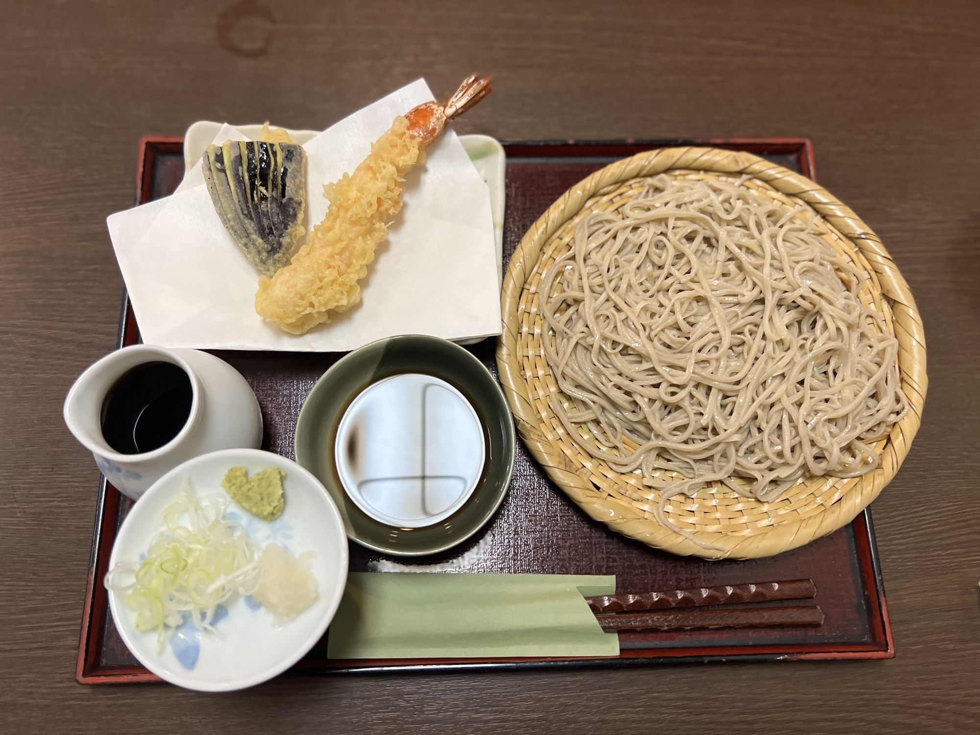 ざるそばに大きな海老の天ぷらと茄子の天ぷらが付きました。