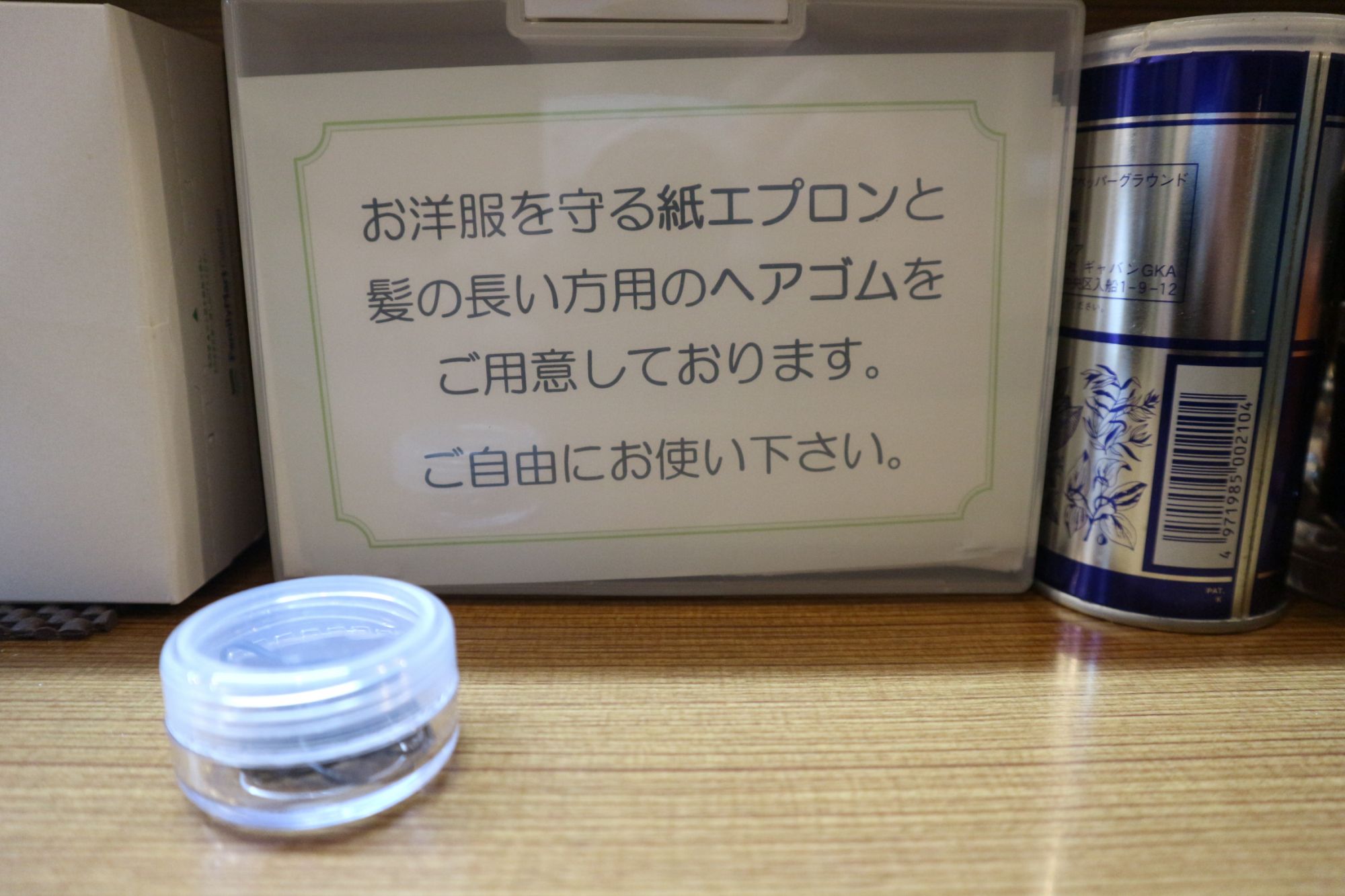 カウンターには、髪の長い人のためのゴムと紙エプロンも用意してありました。心遣いが嬉しいです。