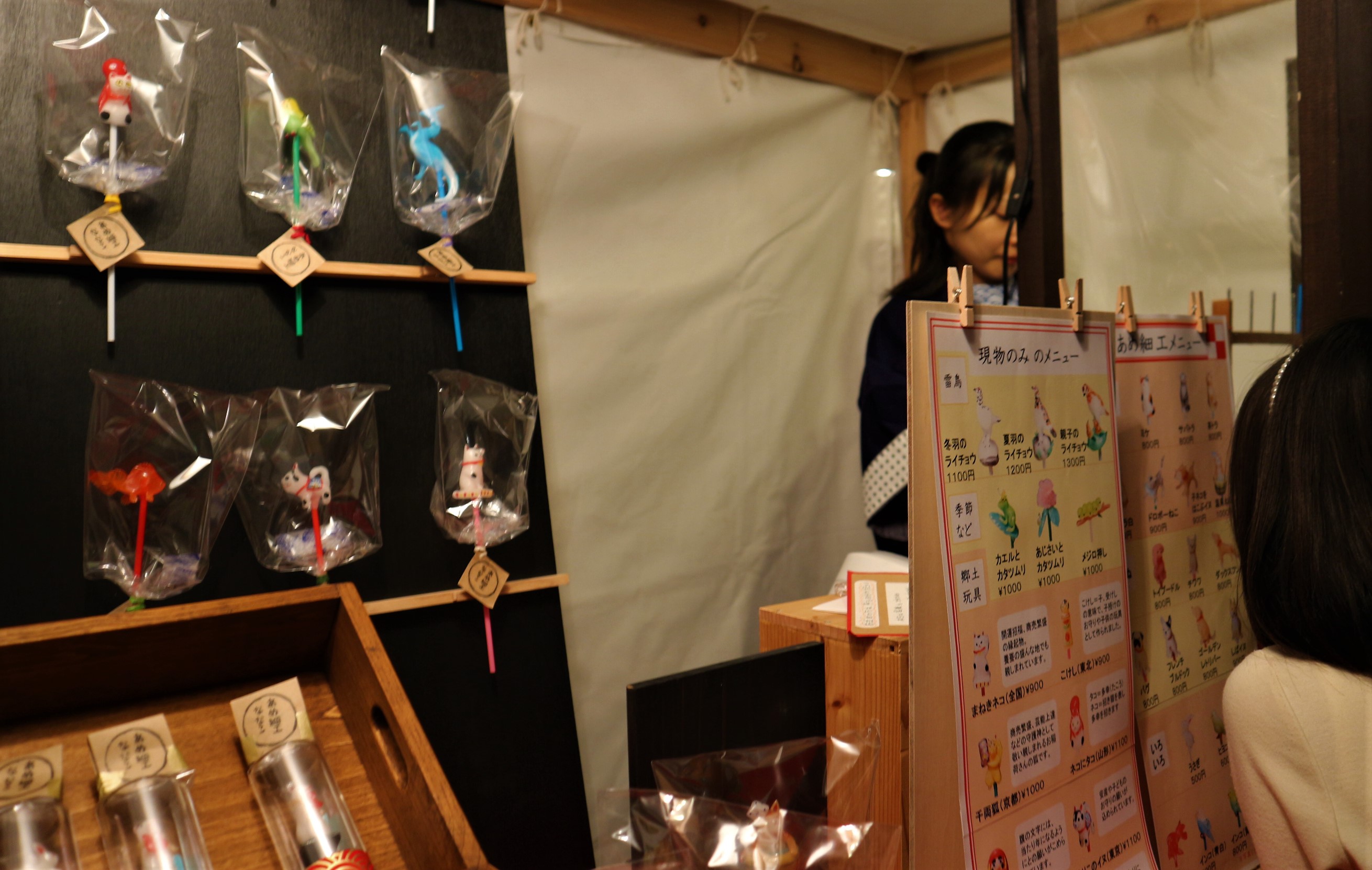 飴細工のお店は、子供に大人気 とても食べてしまうことなんか出来ないかわいい飴を買った子供が嬉しそうにしていました。