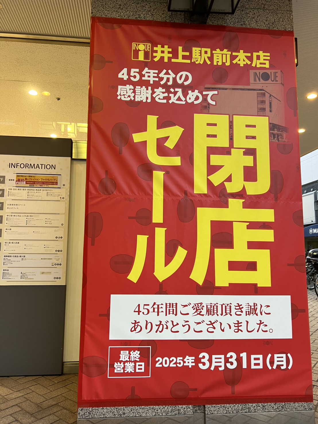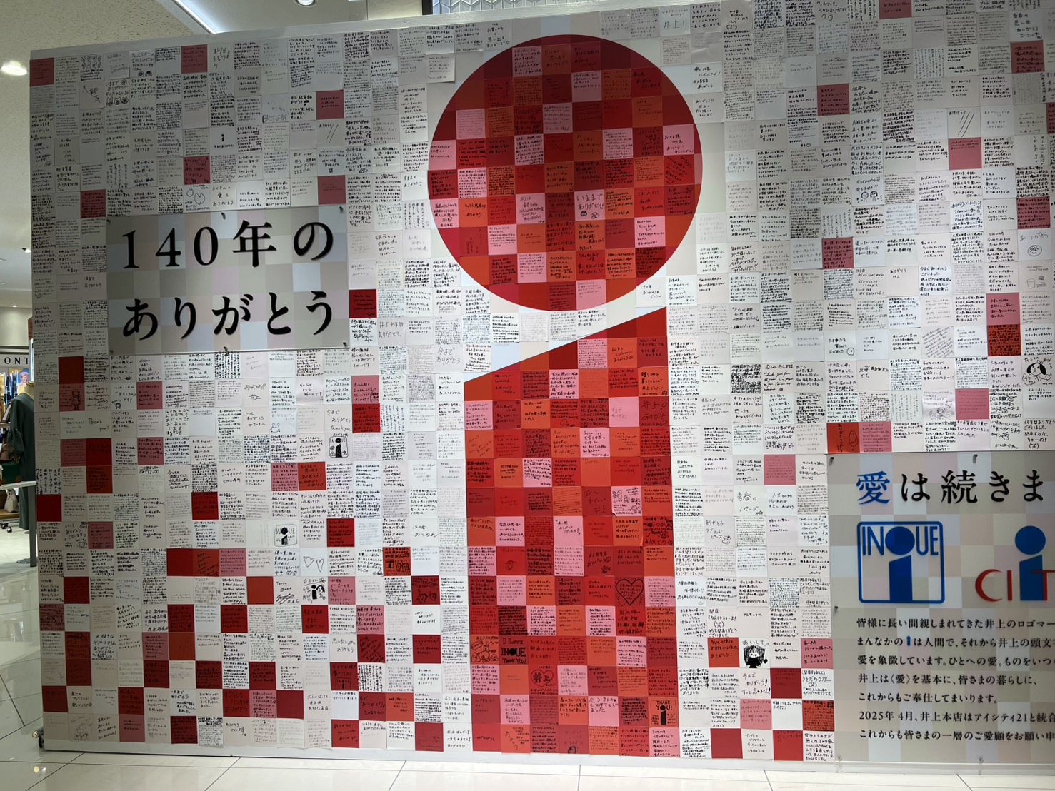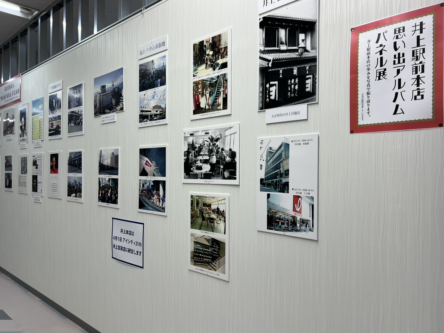 井上駅前本店思い出アルバムパネル展 市街地 松本さんぽ とても気になった場所 松本のお店 冬を楽しむ 2025.3.23 ♥23 松本市の老舗百貨店「井上駅前本店」が45年の歴史を今月末で閉じてしまいます。 井上駅前本店 現在閉店セール開催中です。 閉店セール 入口に入ると感謝のメッセージが書かれたパネルが展示されていました。 140年のありがとう 5階に上がると「井上駅前本店 思い出アルバムパネル展」が開催されています。 パネル展 大正時代の呉服屋さんの時の写真から六九にあった頃 貴重な写真が並んでいます。 写真 年代物のレジスター 昭和20年代のレジスター 井上仕様の自販機 自販機 松本の街中から百貨店が無くなるのは、本当に寂しいです。 晴れの日 Tweet