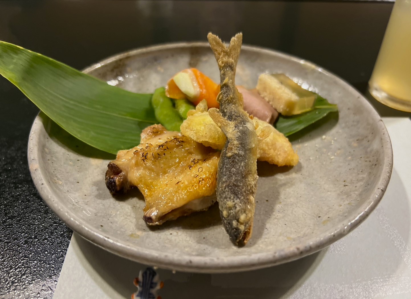 稚鮎のから揚げ・手羽先揚物・イチジクの天麩羅・はものにごもり・りんご信州サーモン巻き・かもの燻製