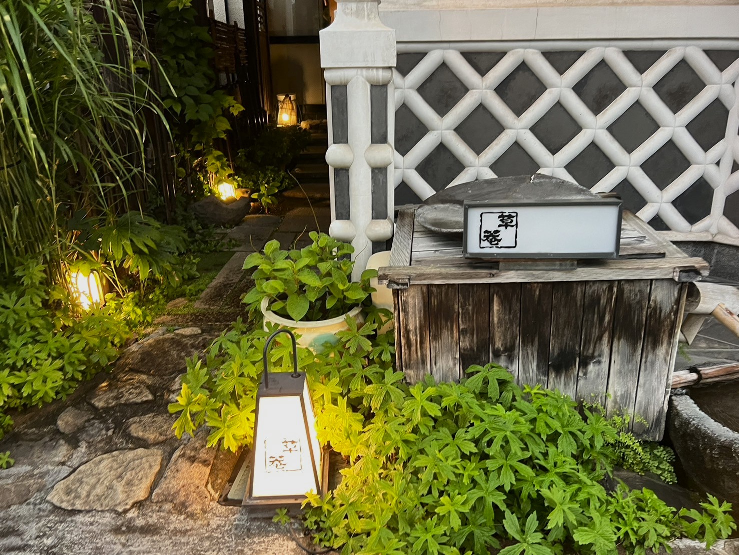 なまこ壁の外観と前の水路の赤い金魚が目を惹きます。