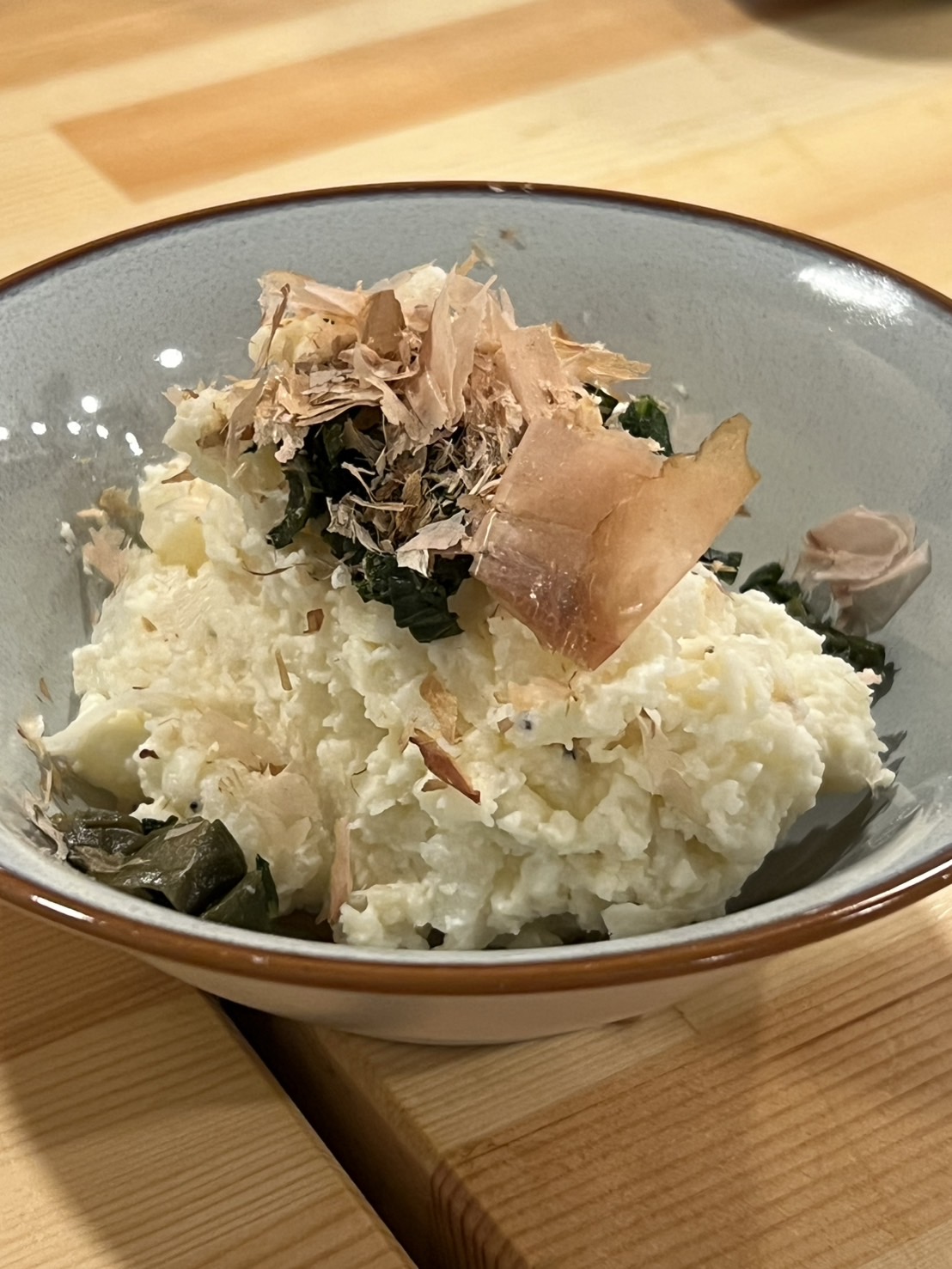 ポテトサラダ 549円(税込み) 上におかかと野沢菜が乗っているオリジナルなポテトサラダです。