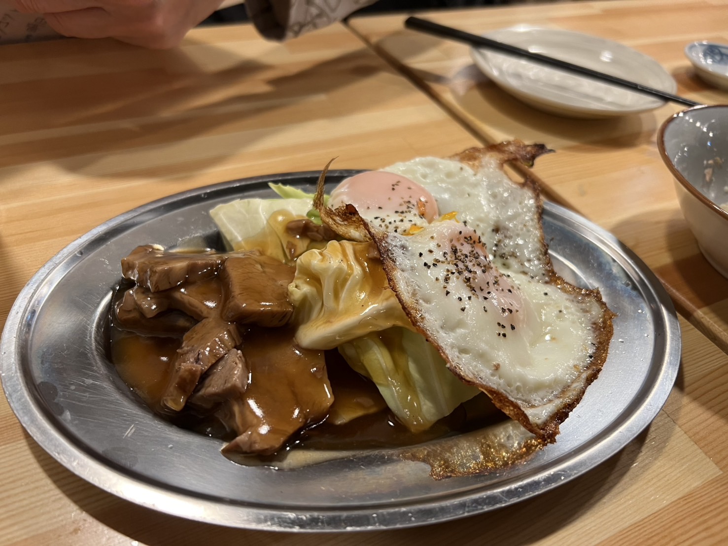 自家製チャーシューエッグ 769円(税込み) チャーシューと目玉焼きが2つに生キャベツ 初めての味