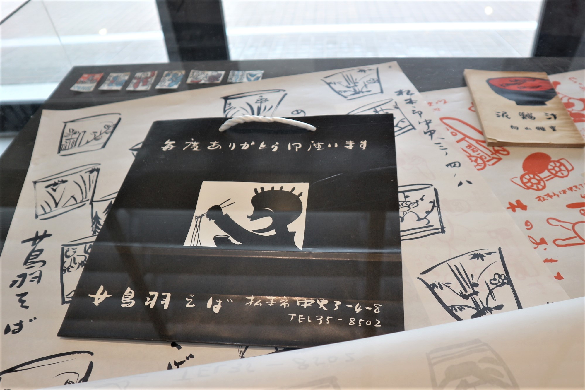 「女鳥羽そば」さんの手提げ袋もデザインされています。女鳥羽川沿いのお店の看板にも使われています。