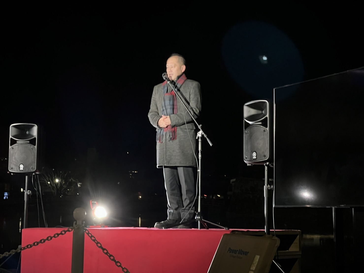 松本市長、松本市議会議長芝山さんの二人からは、開催のご挨拶、イルミネーションを担当したデザイナーさんからイルミネーションの説明を伺いました。