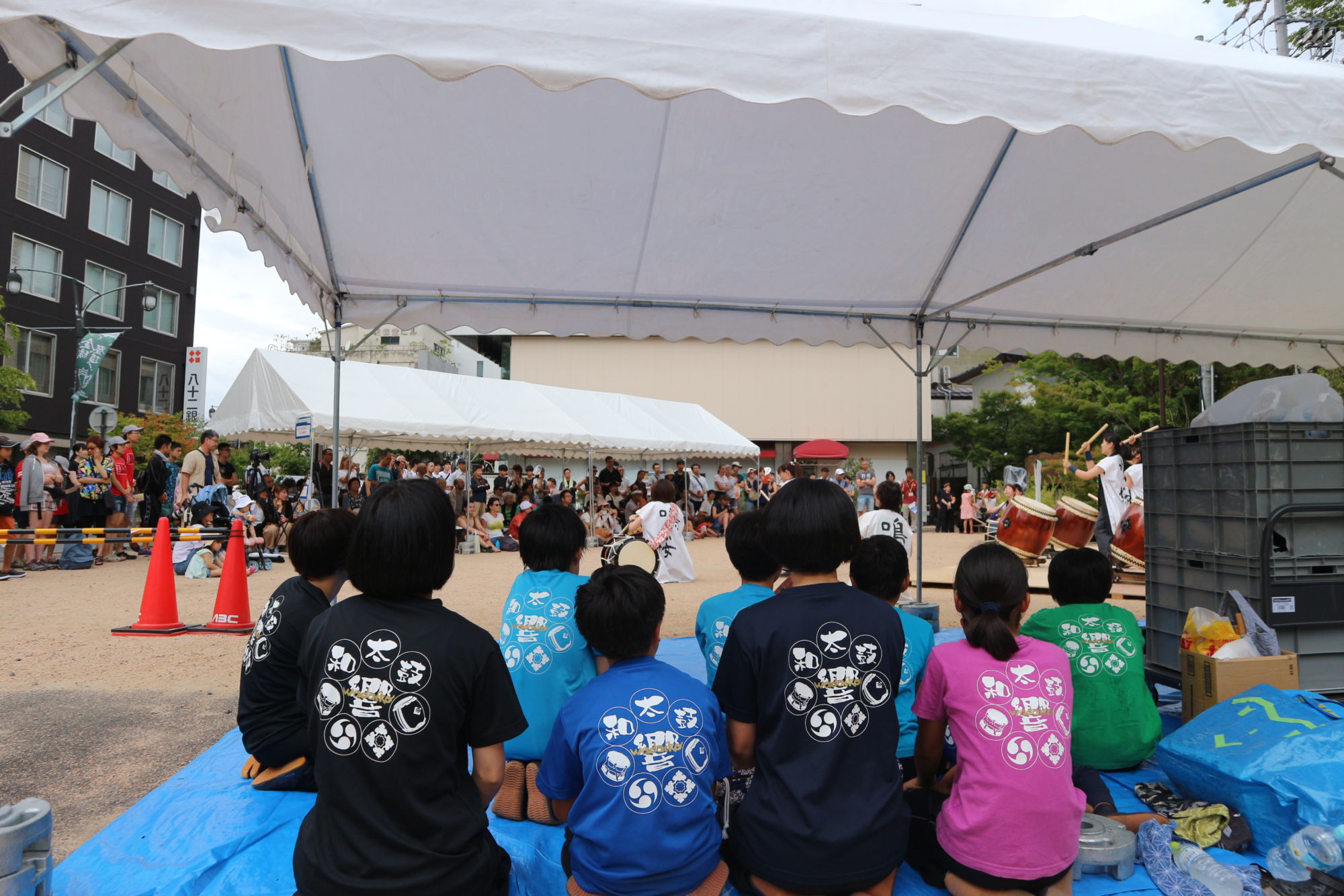 太鼓体験には、大勢の見学者の方々が楽しそうに太鼓を叩いていました。