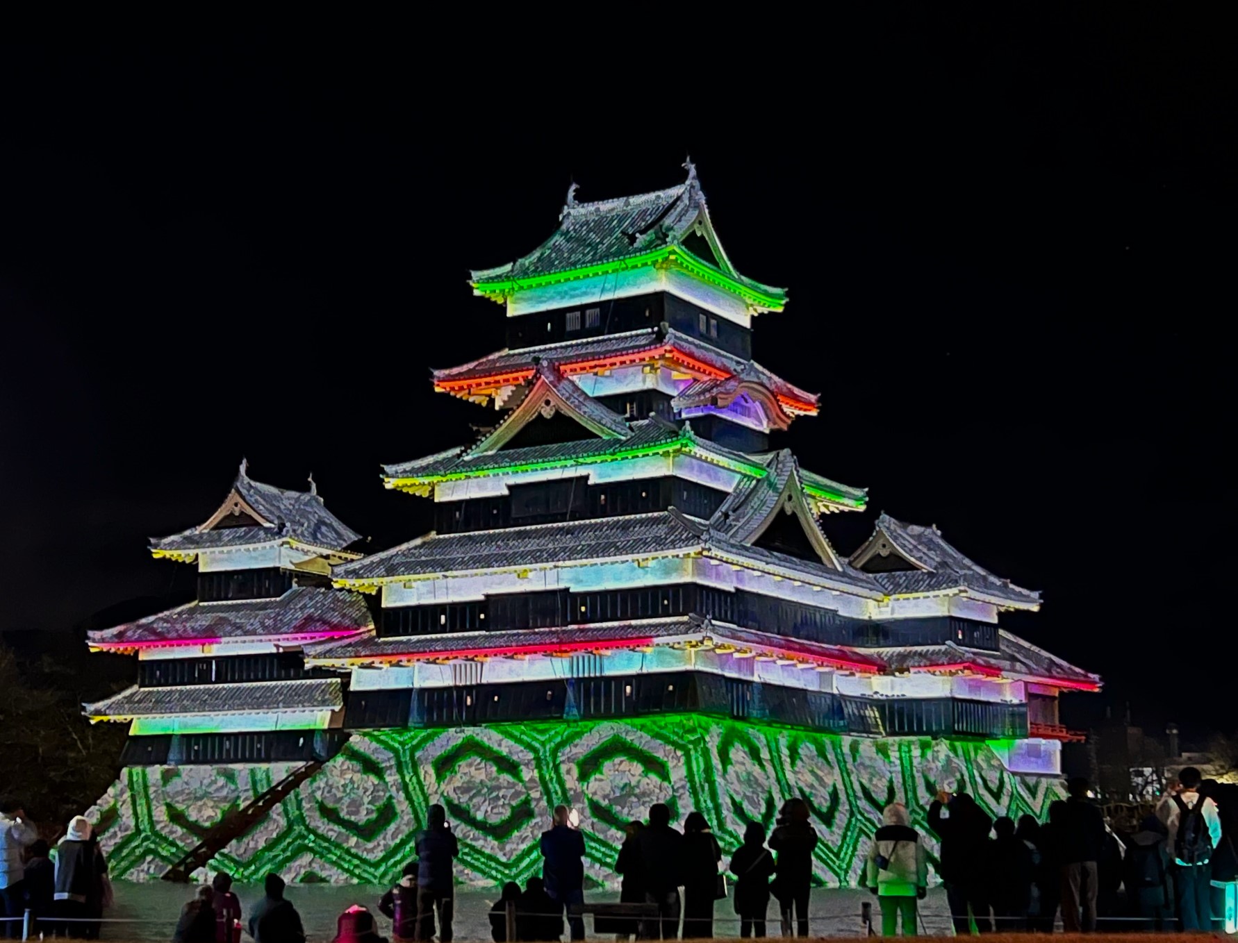 現存国宝5天守の一つで五重六階の天守の中で最古の国宝 松本城の天守や石垣などに、豪壮な天守を築いた城主・石川数正が描かれた屏風絵が躍動するデジタルアニメーションや雪の結晶や氷などをモチーフとしたデジタルアート、北アルプスに美しく咲き誇る百花繚乱の花々など、ダイナミックで幻想的なプロジェクションマッピング映像を投影します。(株式会社一旗HPより)