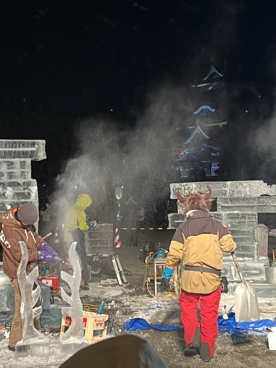 そんな寒さの中朝まで氷彫の制作が続きます。