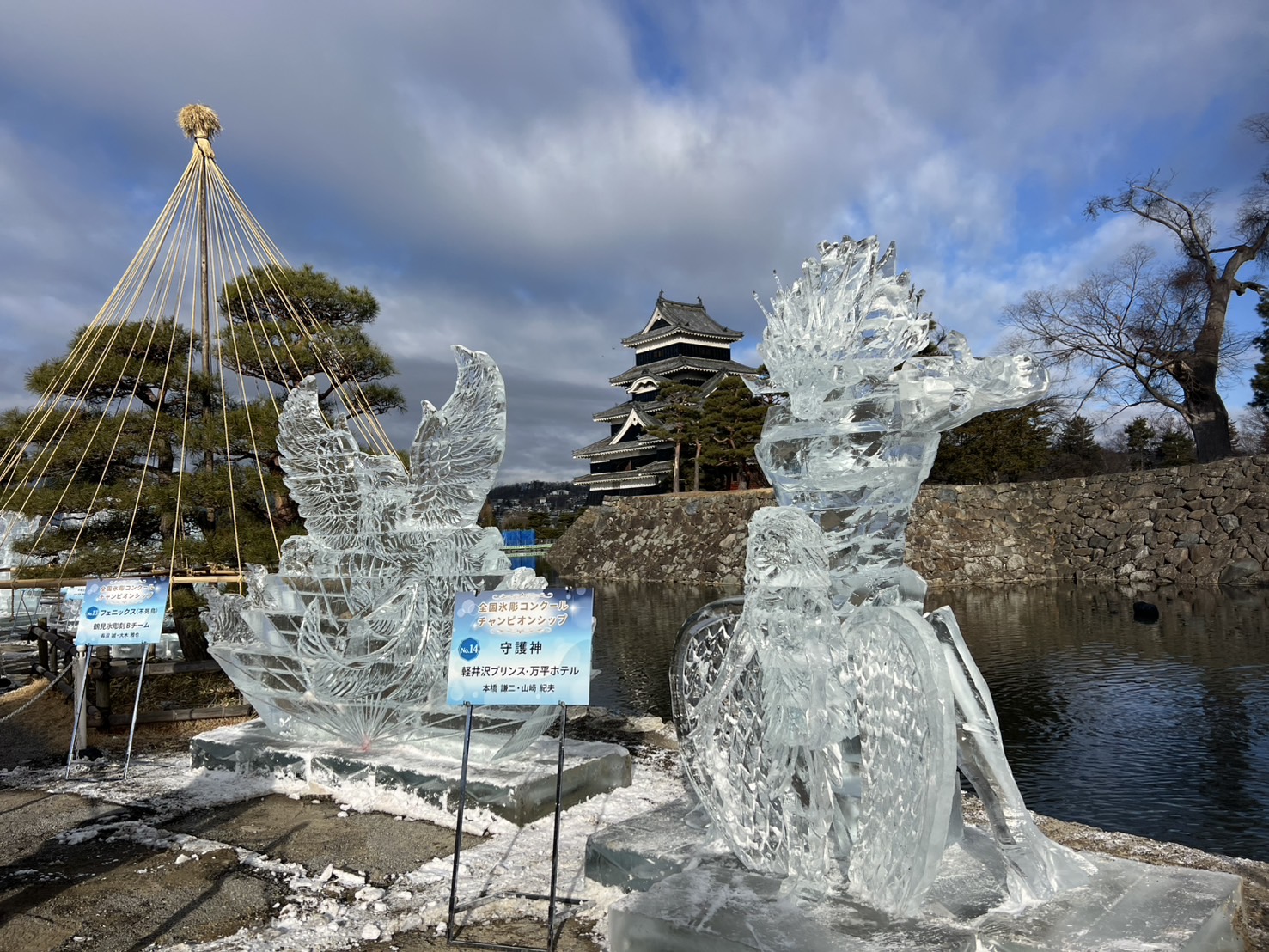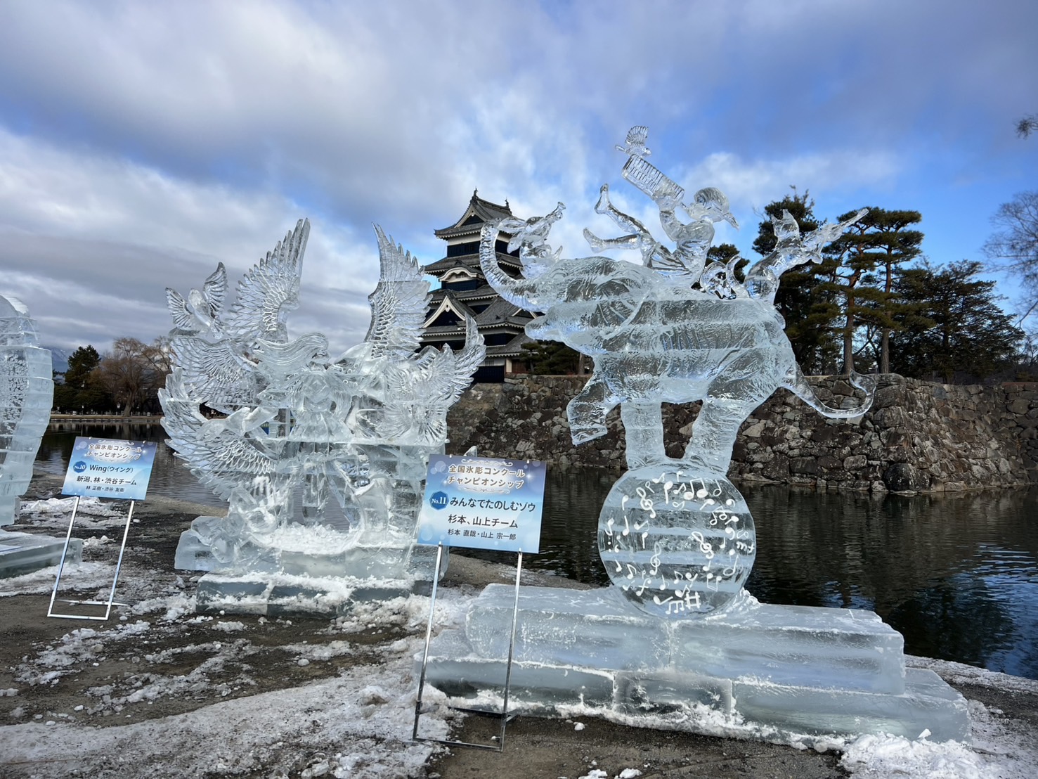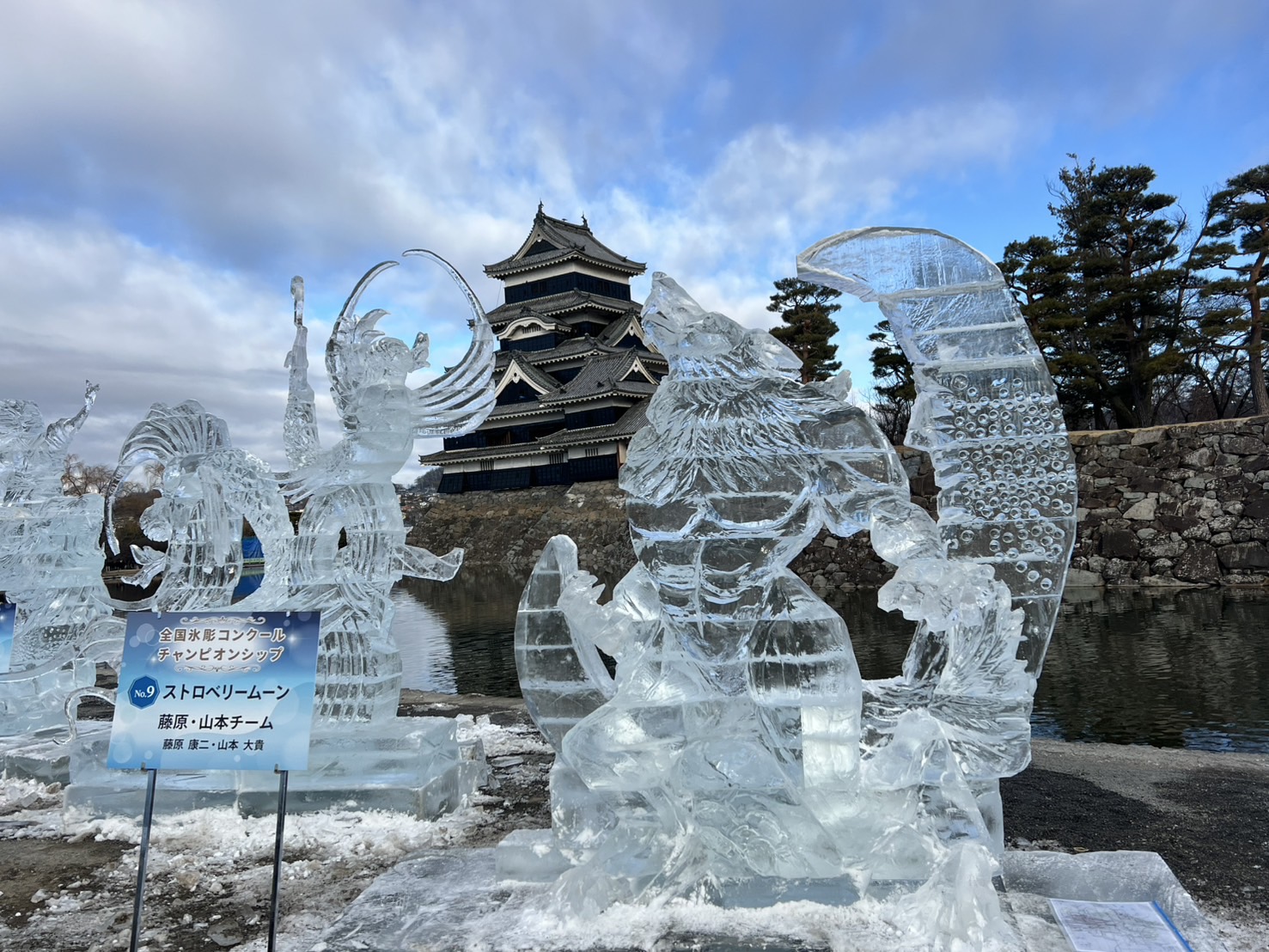 松本城公園では、国宝松本城氷彫フェスティバルチャンピオンシップの作品が並んでいました。